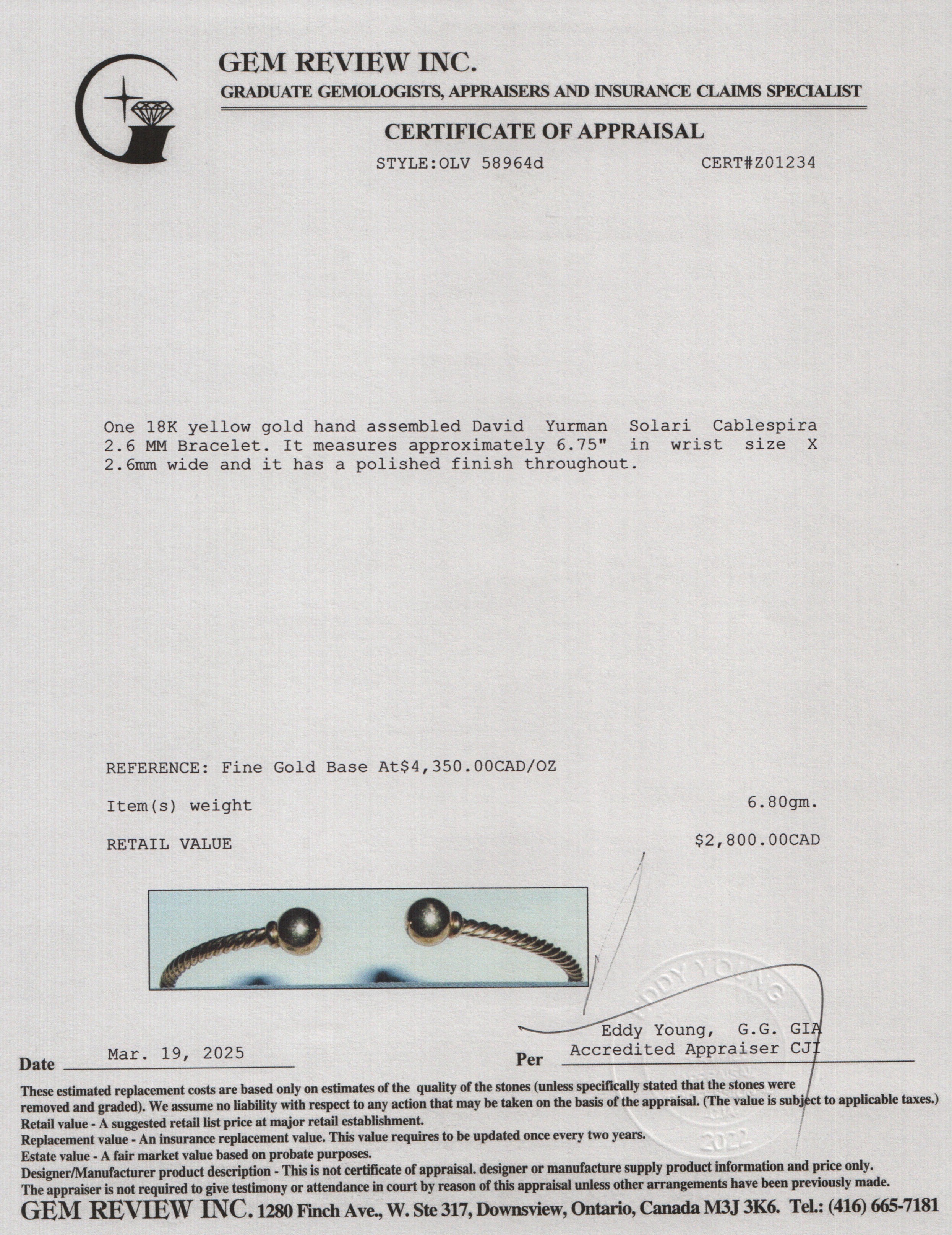 18k Yellow Gold Solari Cablespira 2.6 MM Bracelet w/ Box