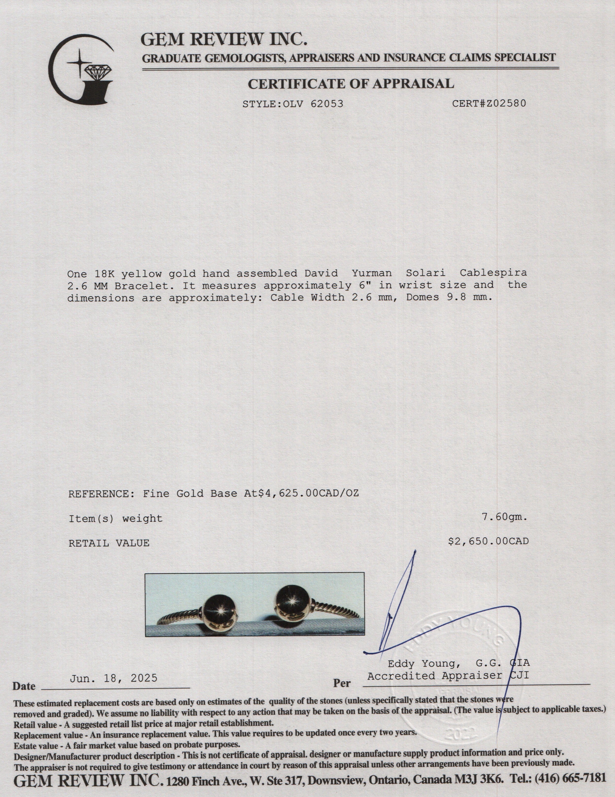18k Yellow Gold Solari Cablespira 2.6 MM Bracelet w/ Box