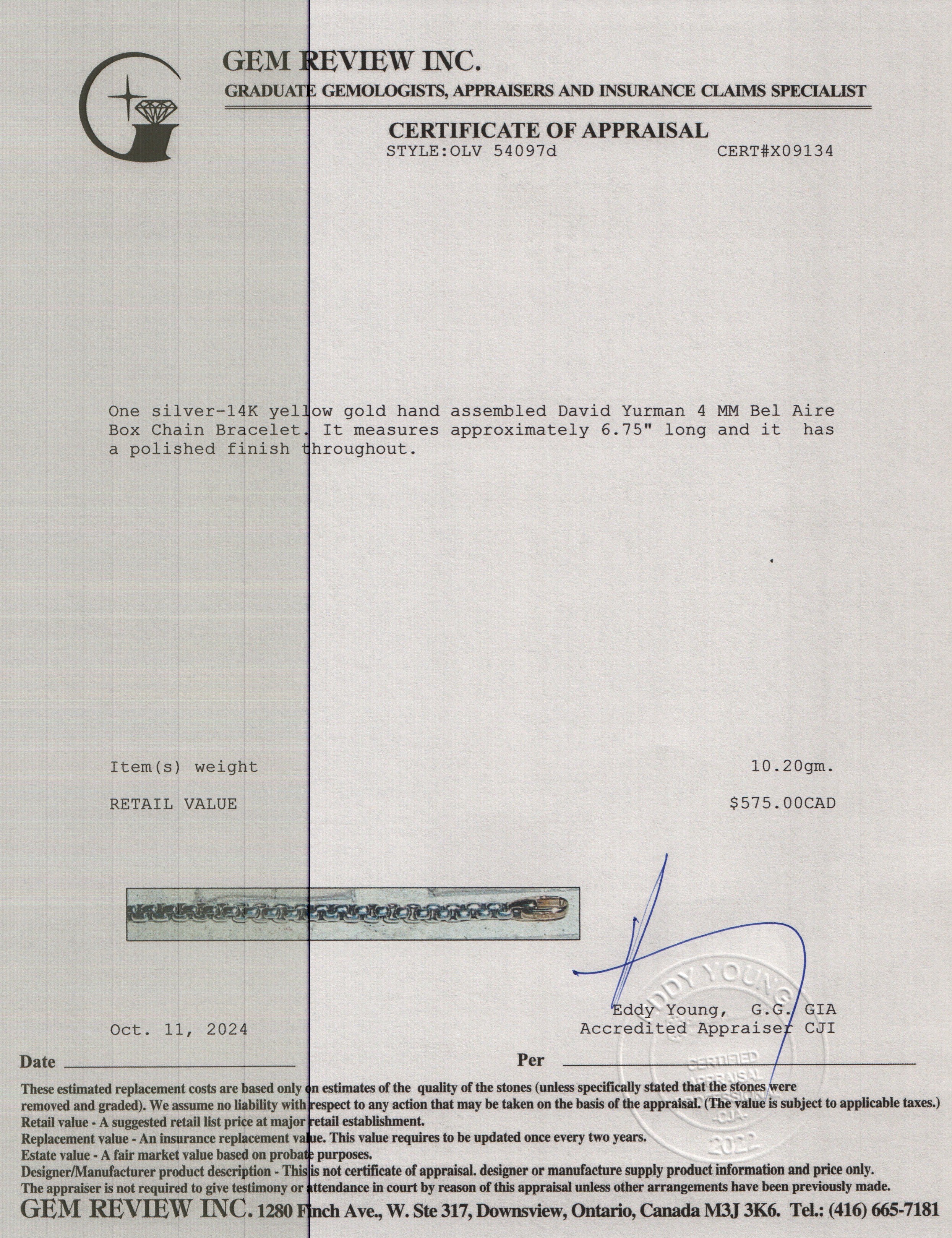 2024 Sterling Silver & 14k Yellow Gold 4 MM Bel Aire Box Chain Bracelet w/ Box & Receipt
