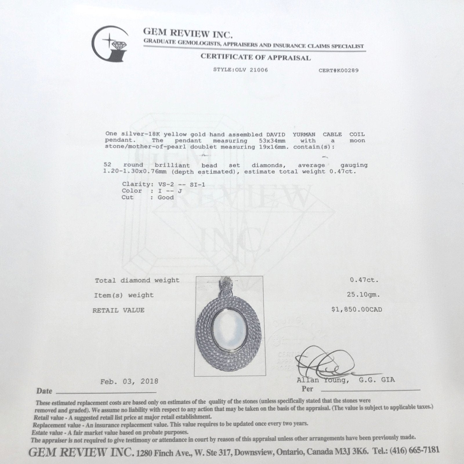 David Yurman Cable Coil Pendant in Sterling and 18kt Yellow Gold; Approximately 0.47 Total Diamond Carat Weight; Moon Stone/ Mother-of-Pearl, 19x16mm; Comes with Gem Review Apprais