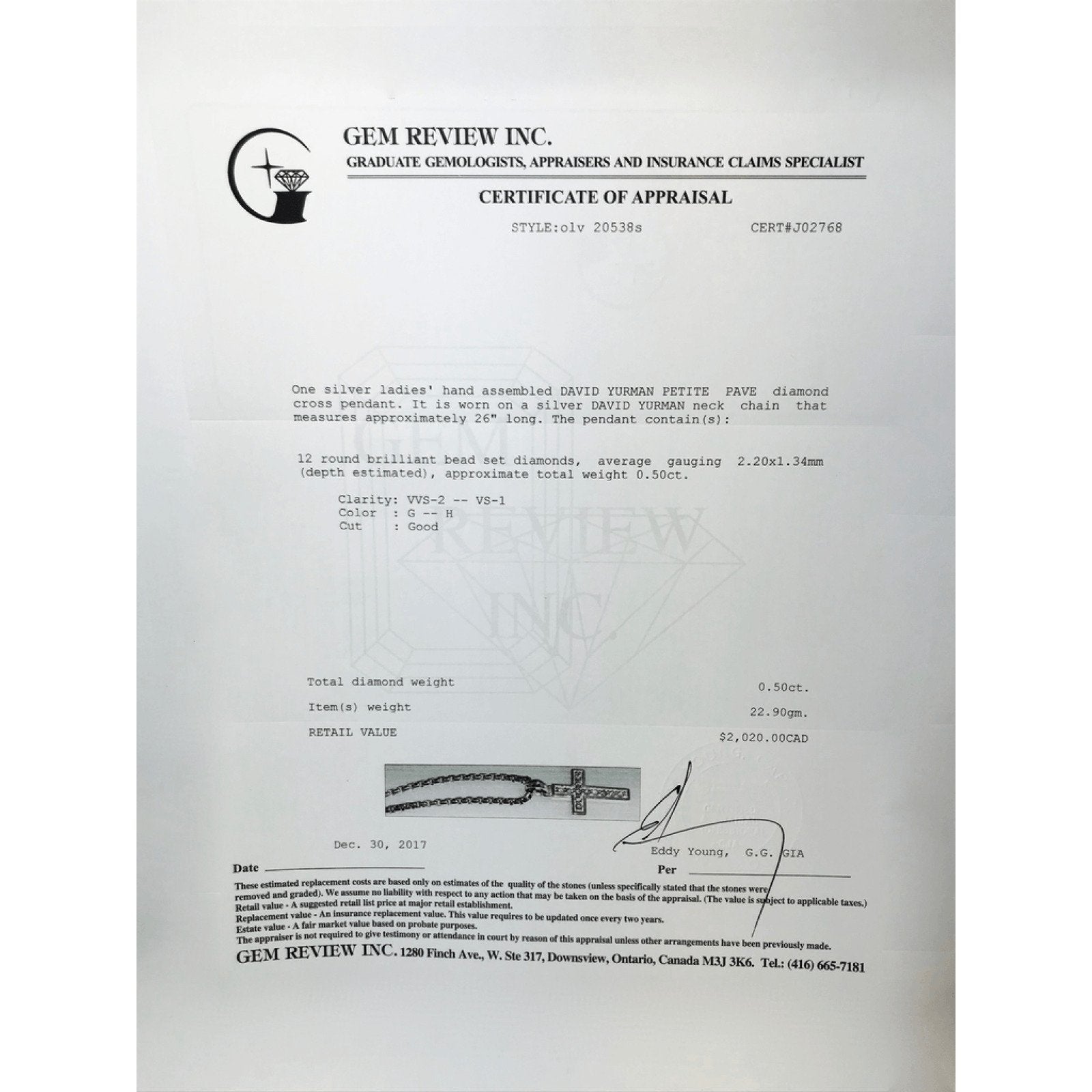David Yurman Petite Diamond Cross Pendant on a 26” Box Chain in Sterling Silver; Approximately 0.50 Total Diamond Carat Weight, VVS-VS Clarity, G-H Colour; Cross Pendant, 16 mm Wide x 26.5 mm Long; Box Chain, 2.5 mm WIde; Comes with Gem Review Appraisal