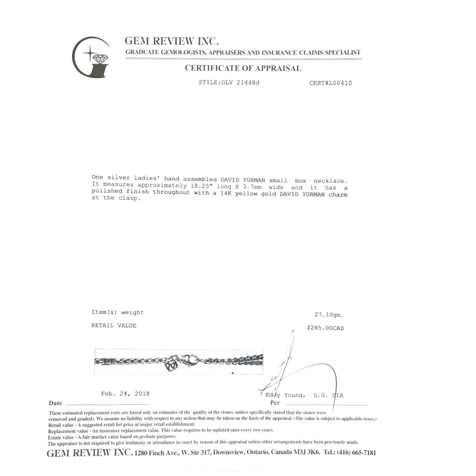 David Yurman Small Box Necklace in Sterling Silver with 14K Yellow Gold Charm at the Clasp; Approximate Length: 18.25”; Approximate Width: 3.7mm; Comes with Gem Review Appraisal
