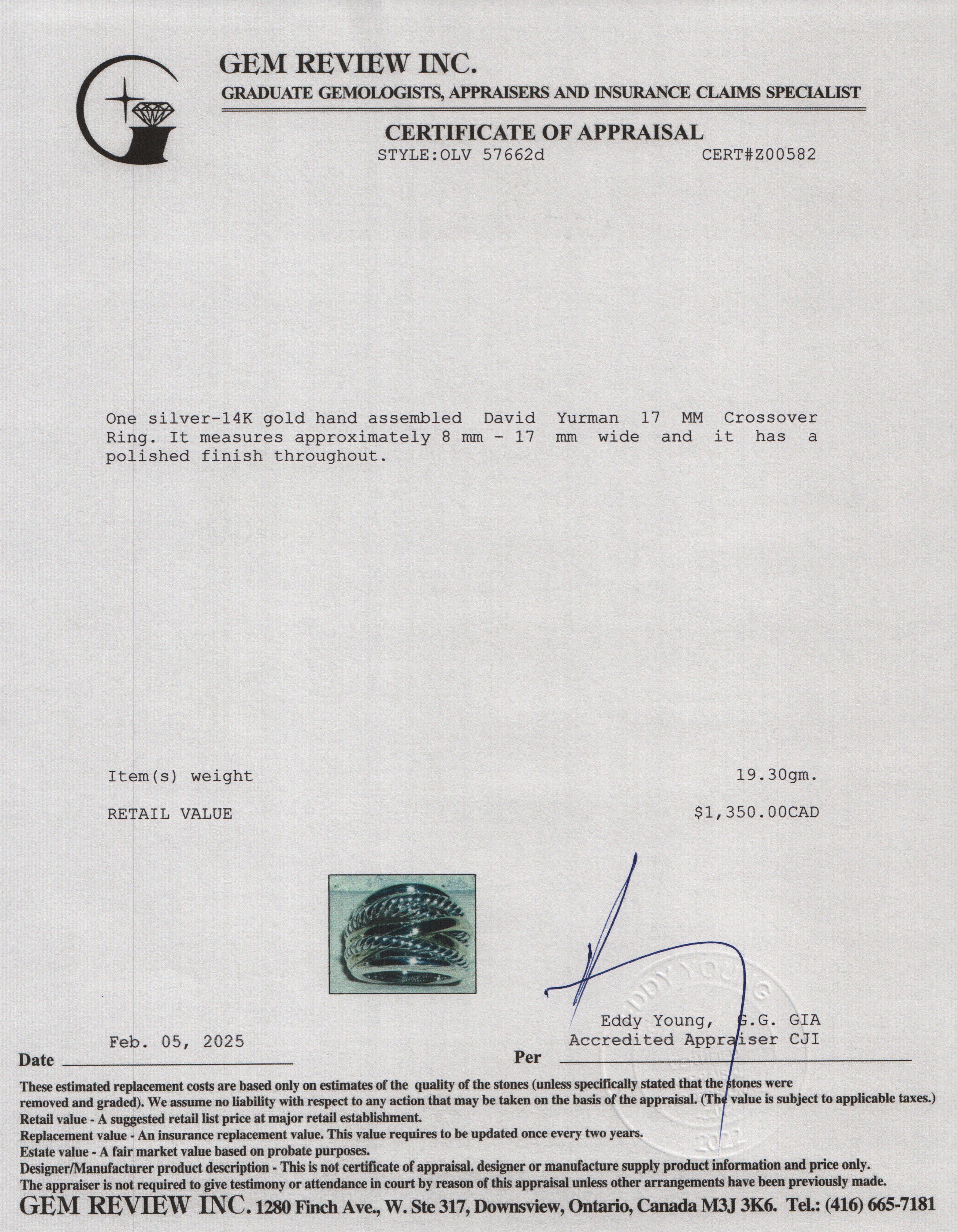 Sterling Silver & 14k Yellow Gold 17 MM Crossover Ring, Size 6.5