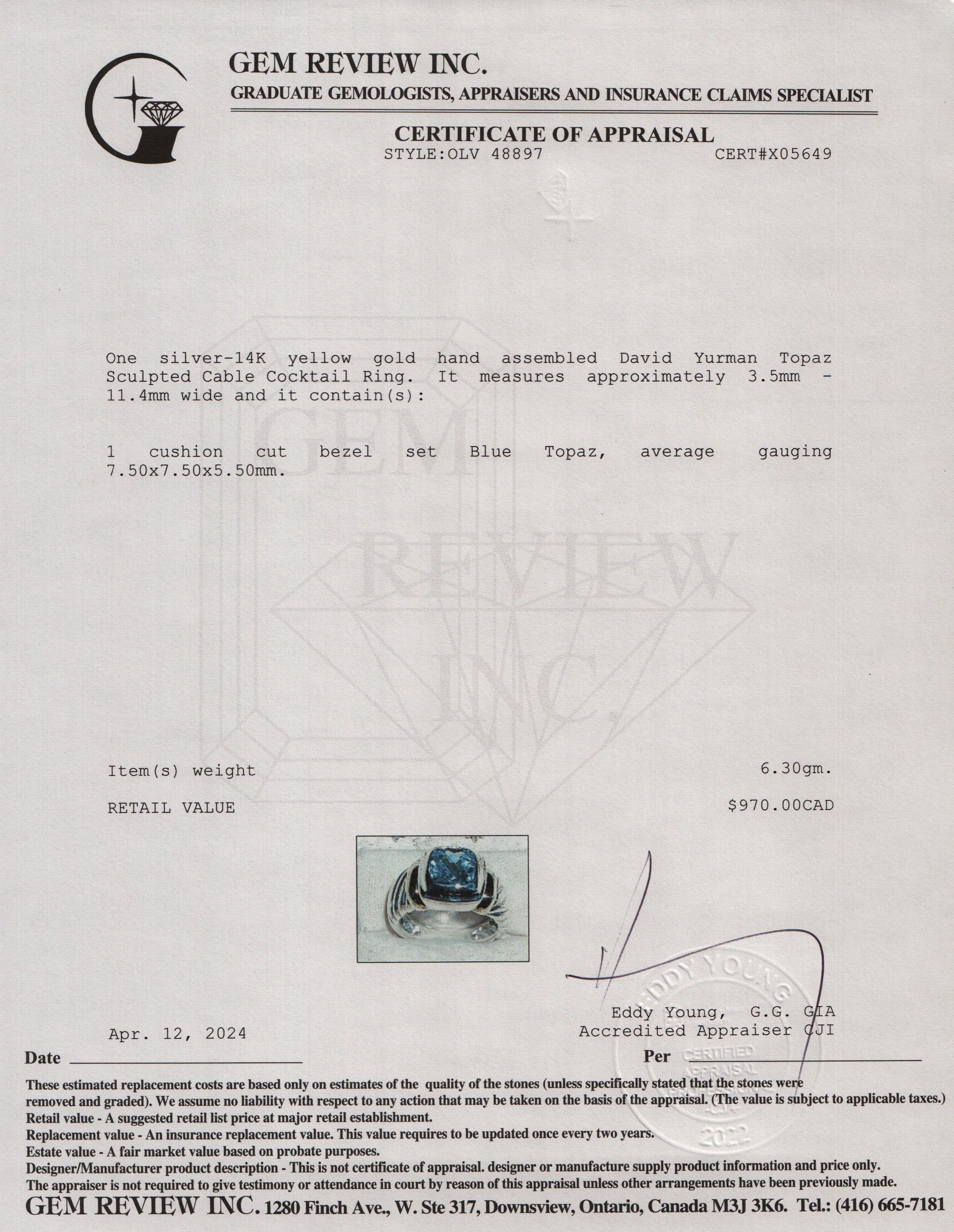 Sterling Silver & 14k Yellow Gold Blue Topaz Sculpted Cable Cocktail Ring, Size 6