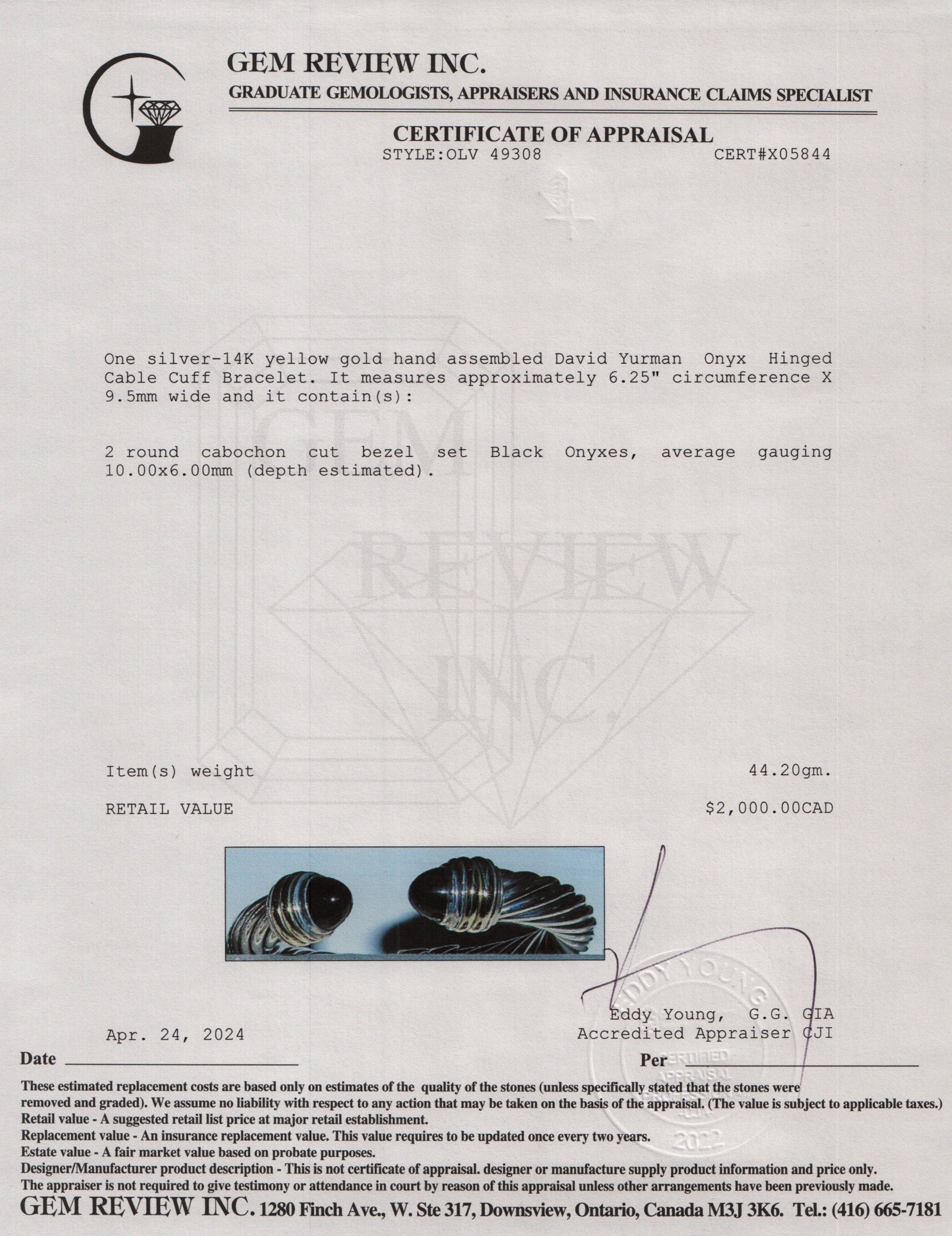 Sterling Silver & 14k Yellow Gold Onyx Hinged Cable Cuff Bracelet