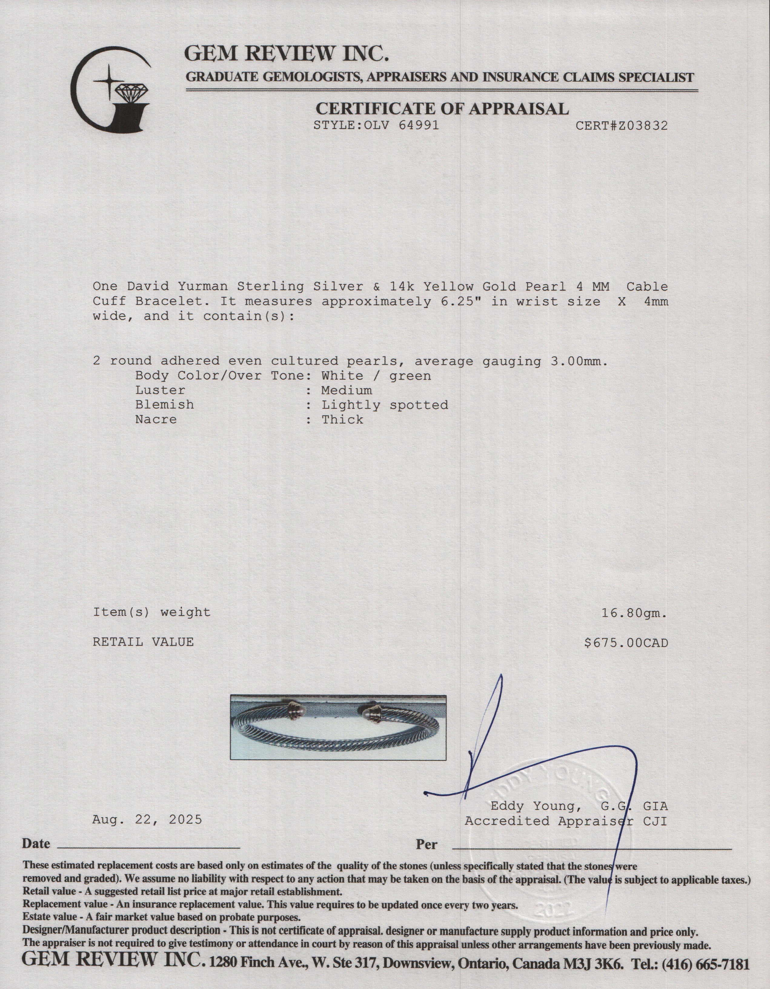 Sterling Silver & 14k Yellow Gold Pearl 4 MM Cable Cuff Bracelet
