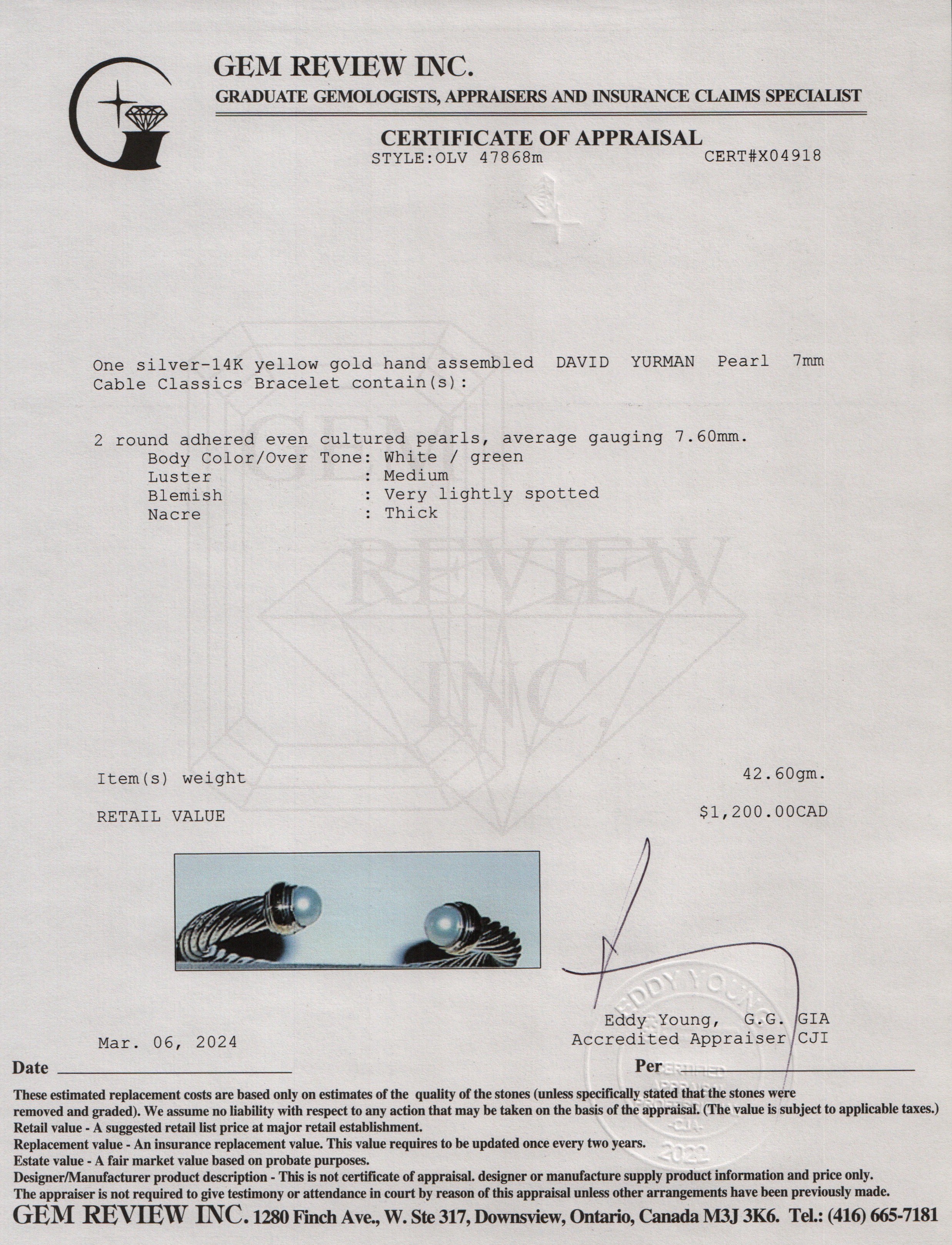Sterling Silver & 14k Yellow Gold Pearl 7 MM Cable Classics Bracelet