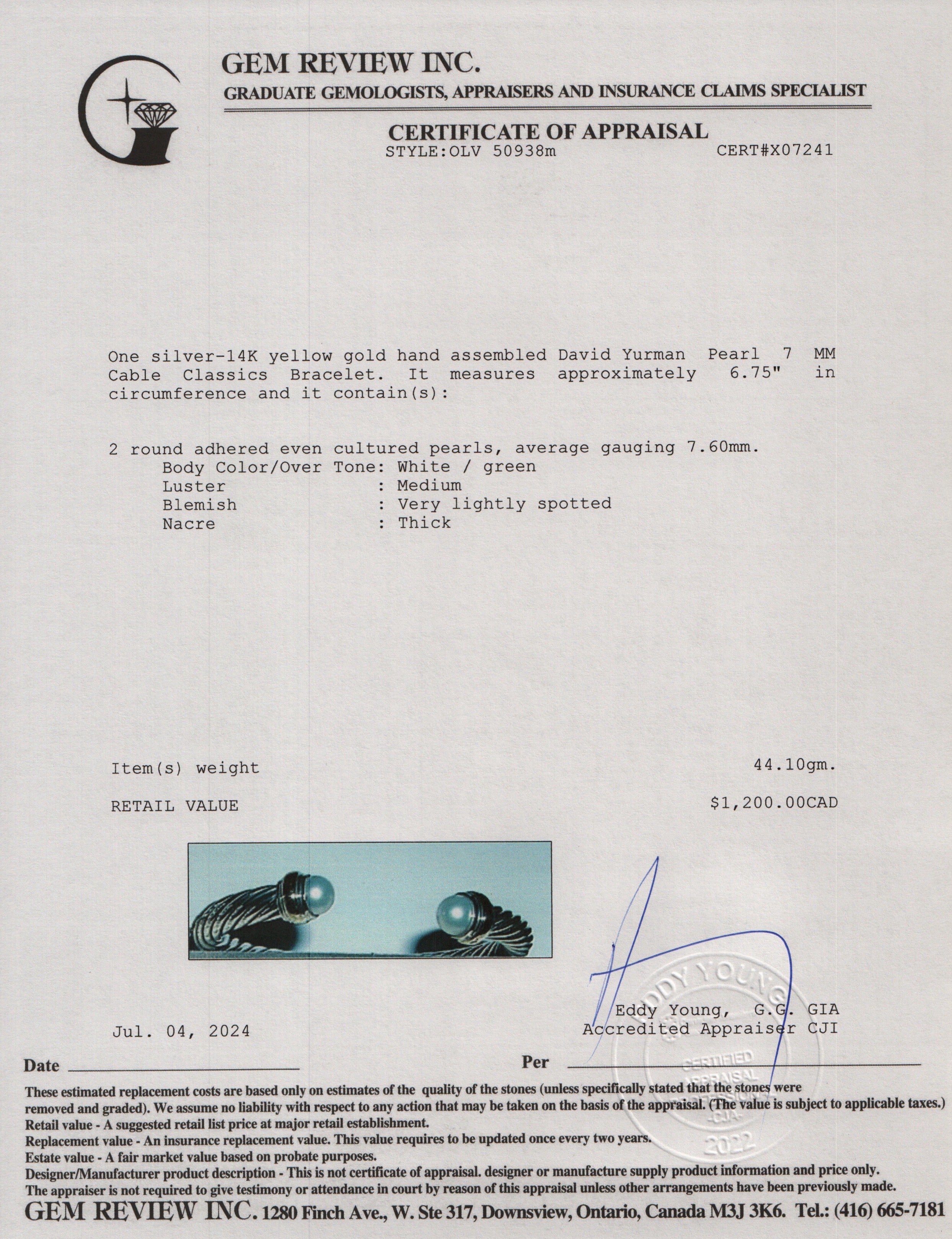 Sterling Silver & 14k Yellow Gold Pearl 7 MM Cable Classics Bracelet