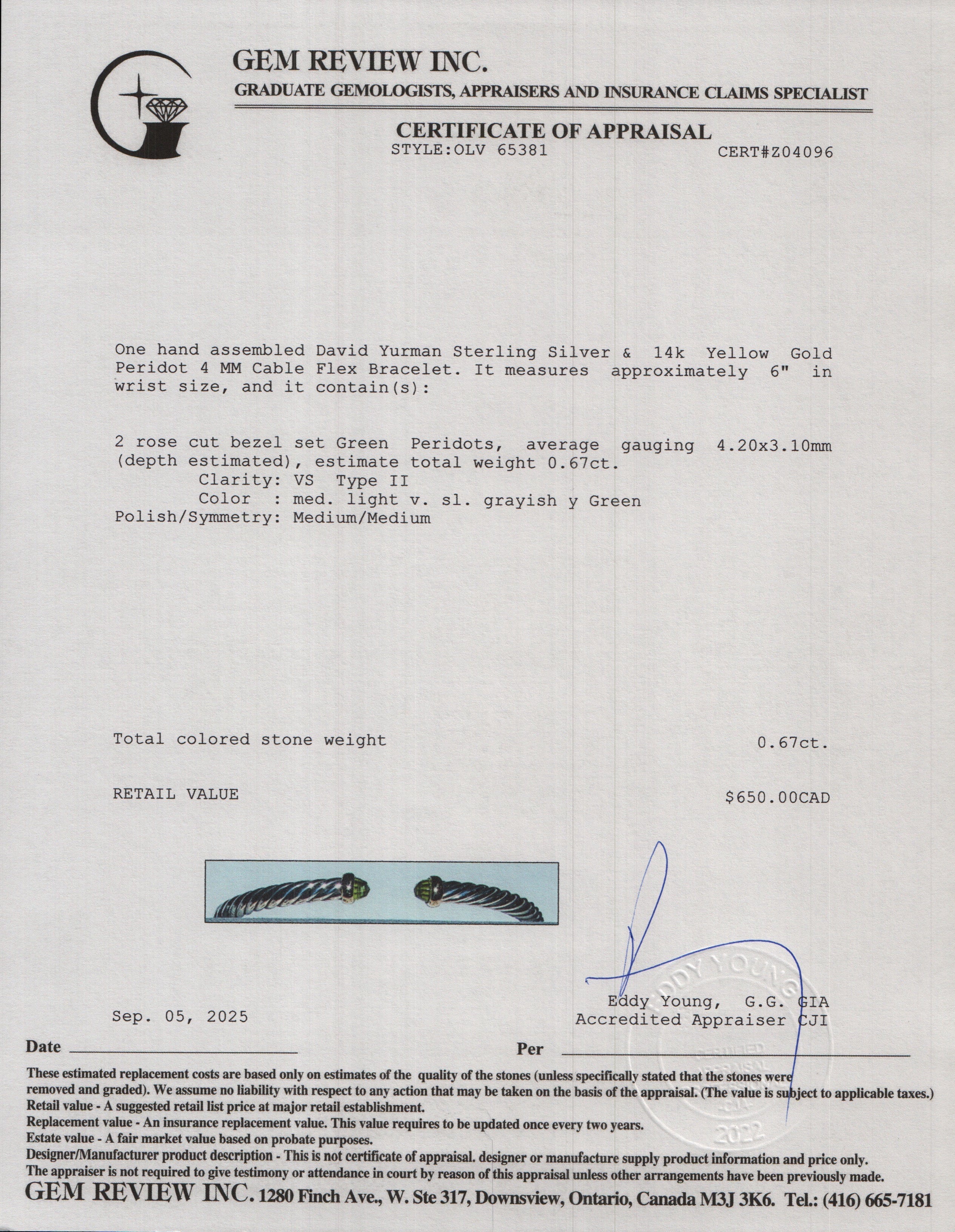 Sterling Silver & 14k Yellow Gold Peridot 4 MM Cable Flex Bracelet w/ Box