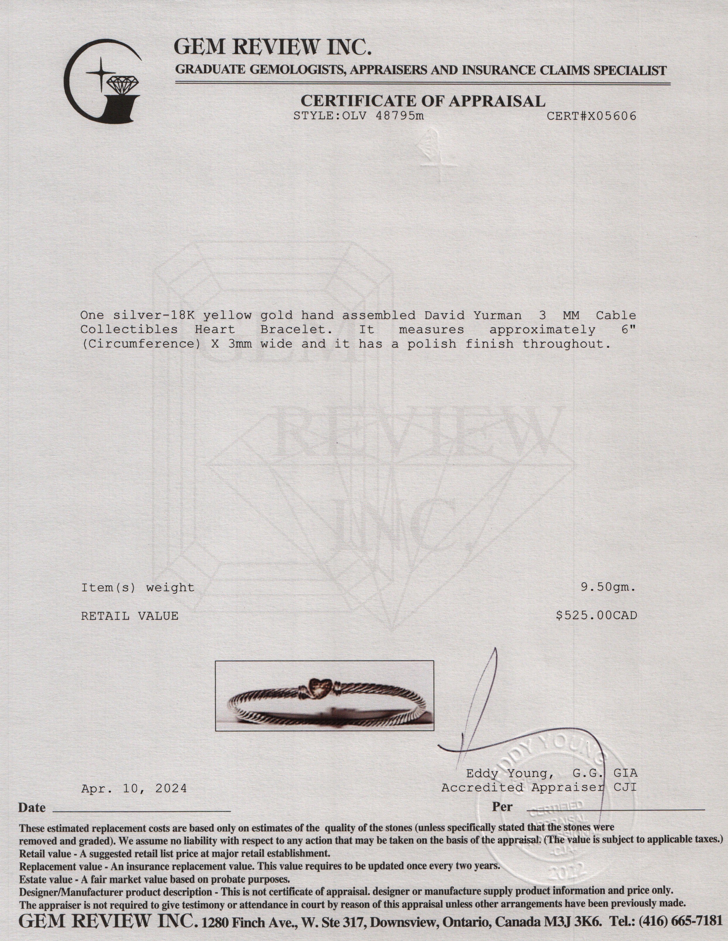 Sterling Silver & 18k Yellow Gold 3 MM Cable Collectibles Heart Bracelet