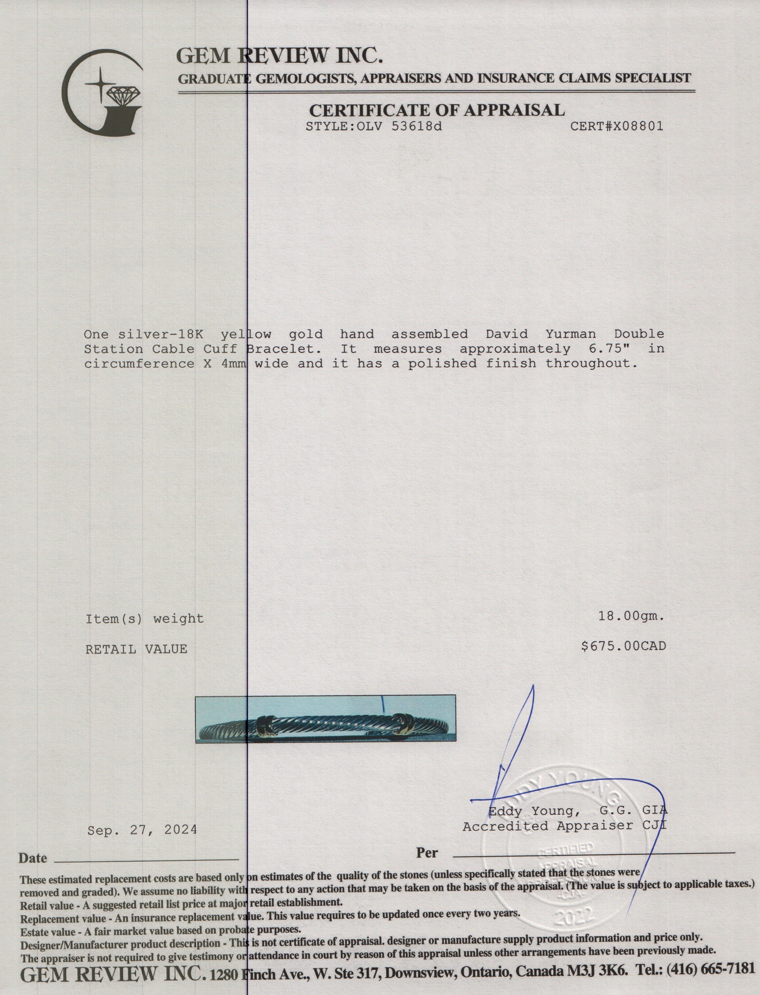 Sterling Silver & 18k Yellow Gold 4 MM Double Station Cable Cuff Bracelet
