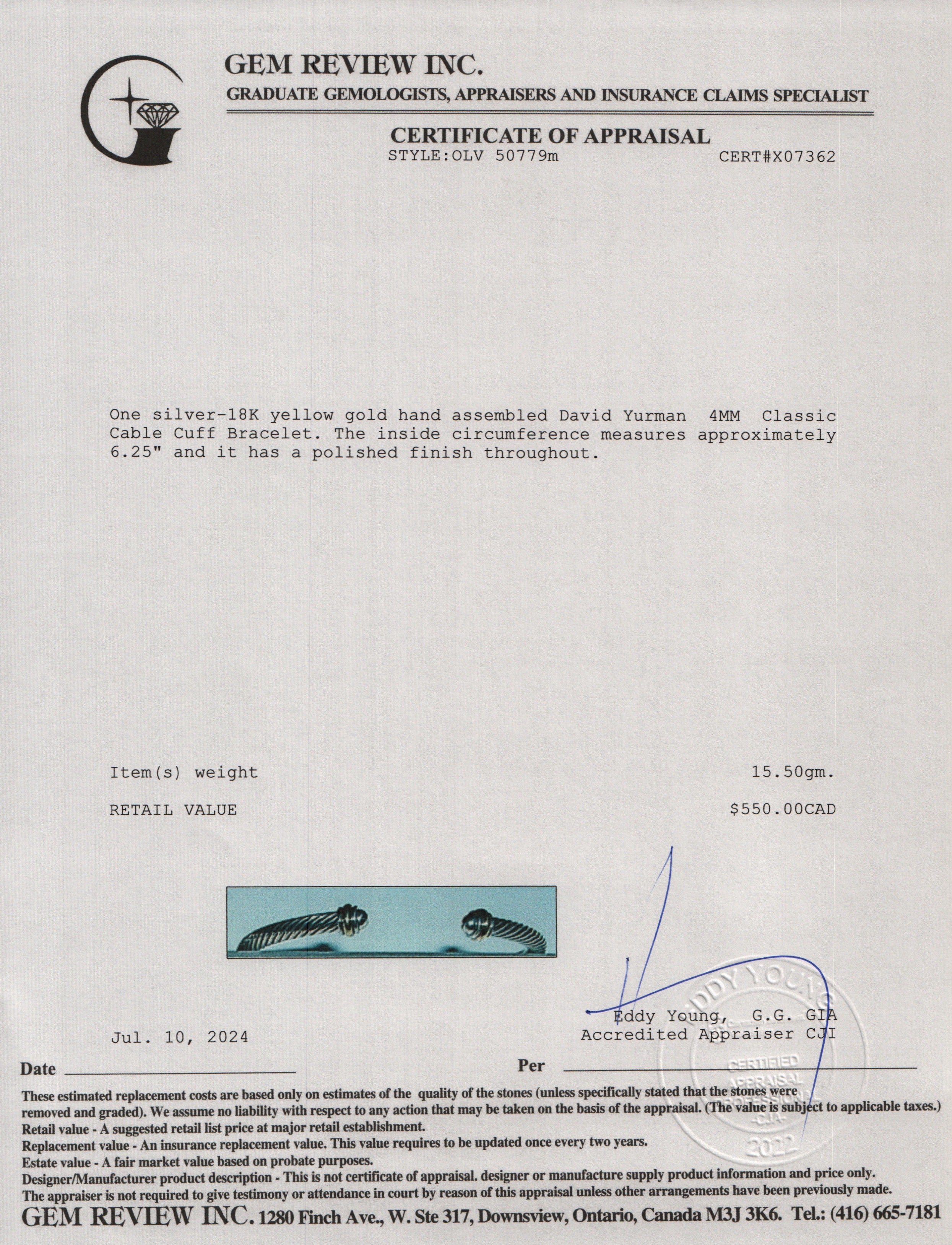 Sterling Silver & 18k Yellow Gold 4MM Classic Cable Cuff Bracelet
