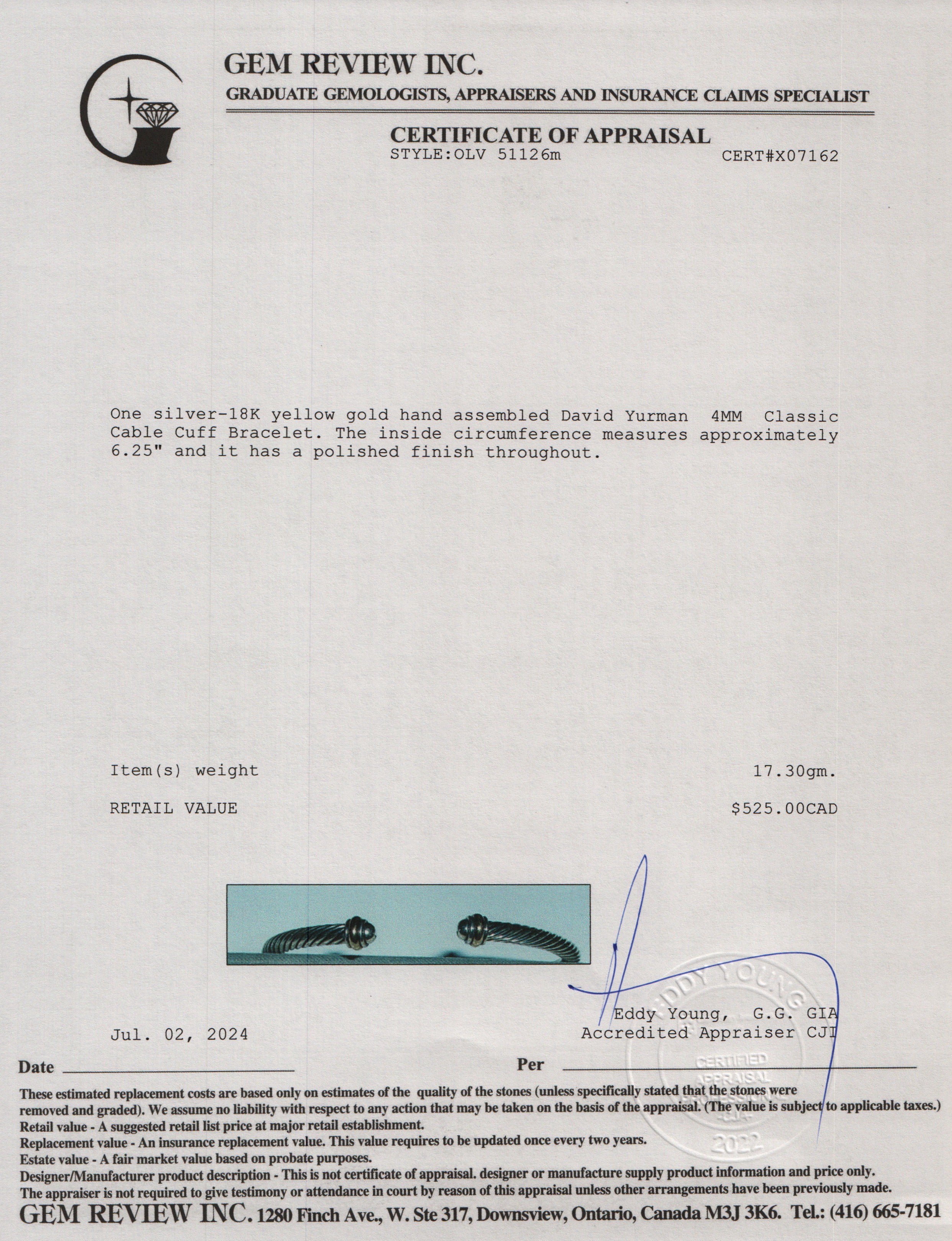 Sterling Silver & 18k Yellow Gold 4MM Classic Cable Cuff Bracelet