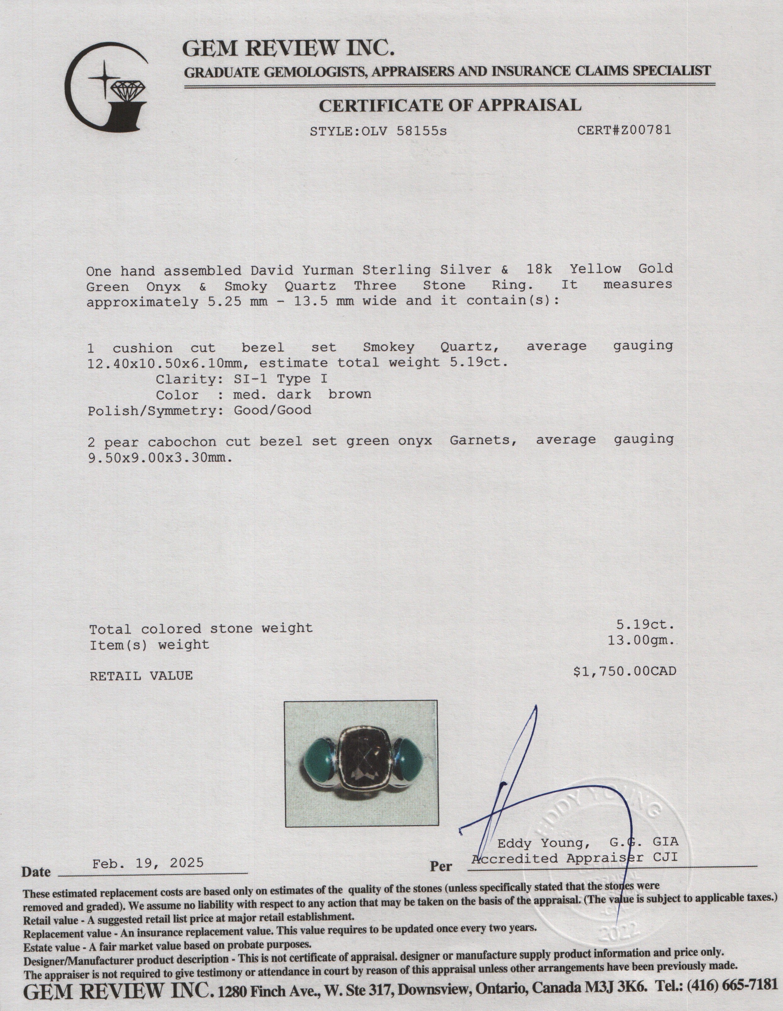 Sterling Silver & 18k Yellow Gold Green Onyx & Smoky Quartz Three Stone Ring, Size 6