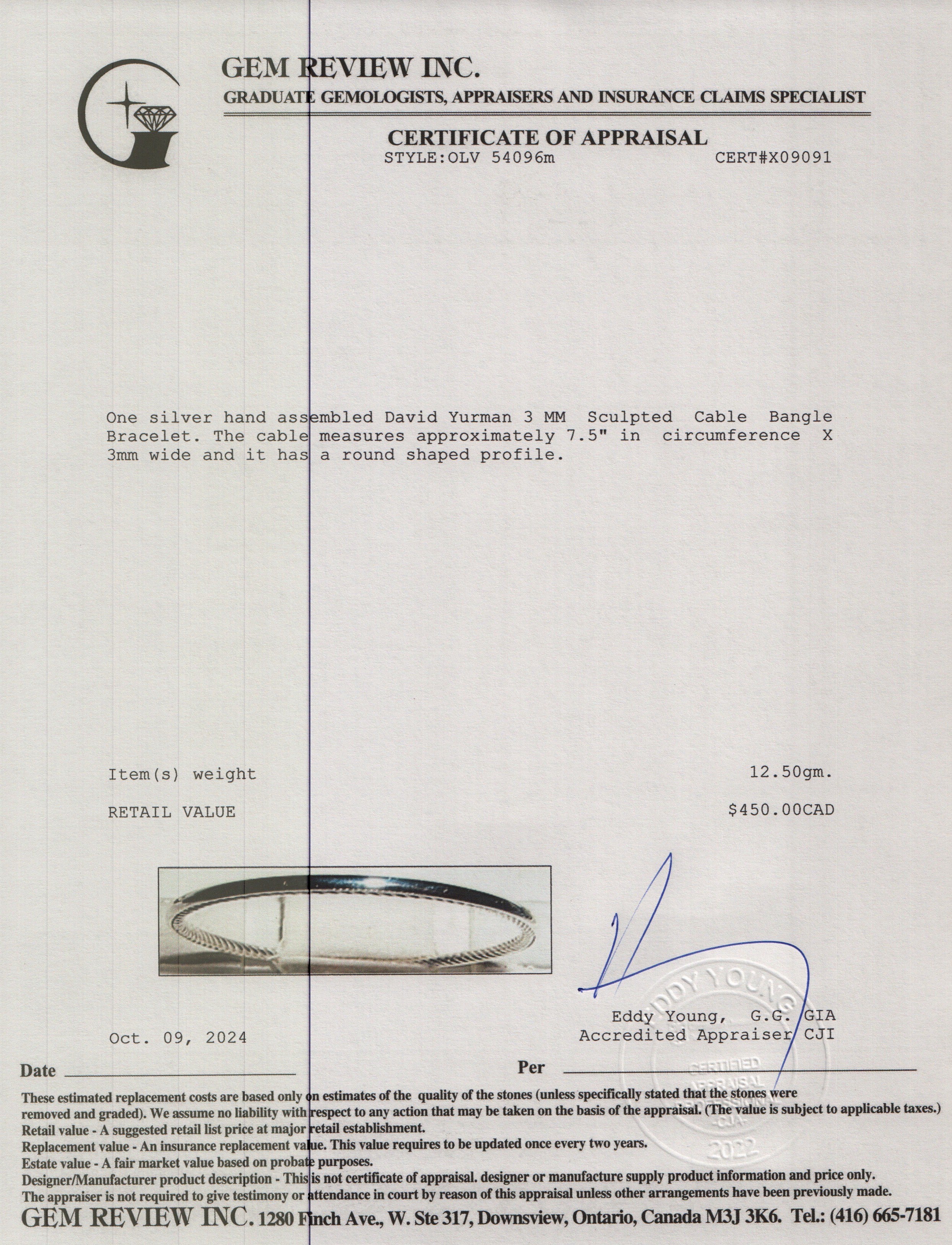 Sterling Silver 3 MM Sculpted Cable Bangle Bracelet