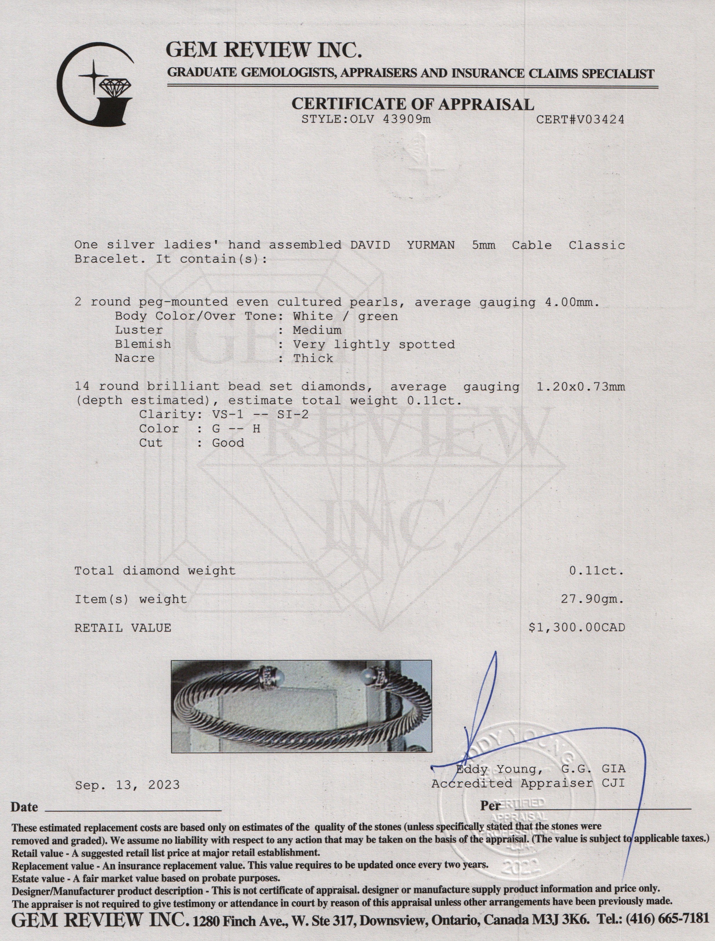 Sterling Silver 5 MM Cable Classics Bracelet with Pearls & Diamonds