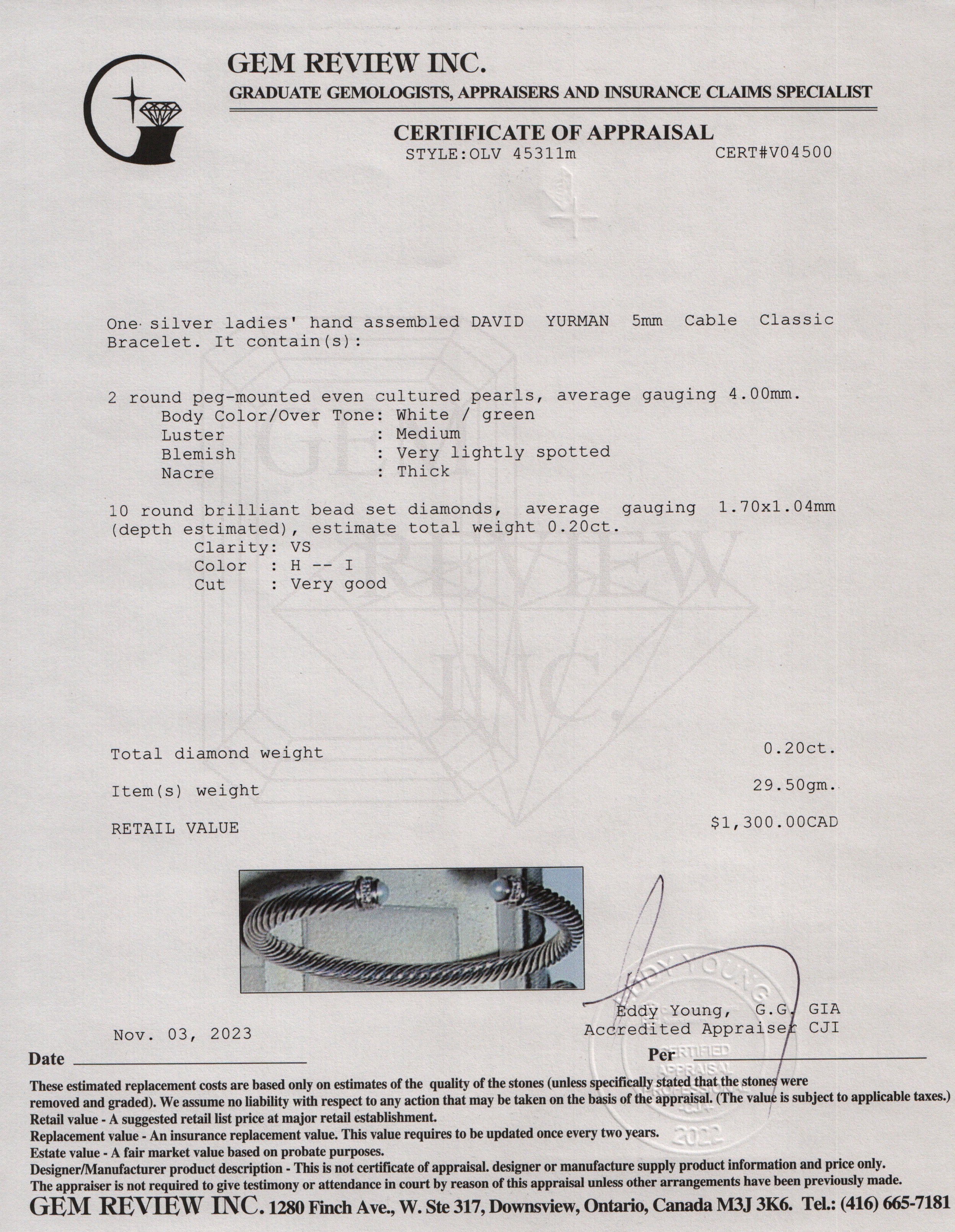Sterling Silver 5 MM Cable Classics Bracelet with Pearls & Diamonds