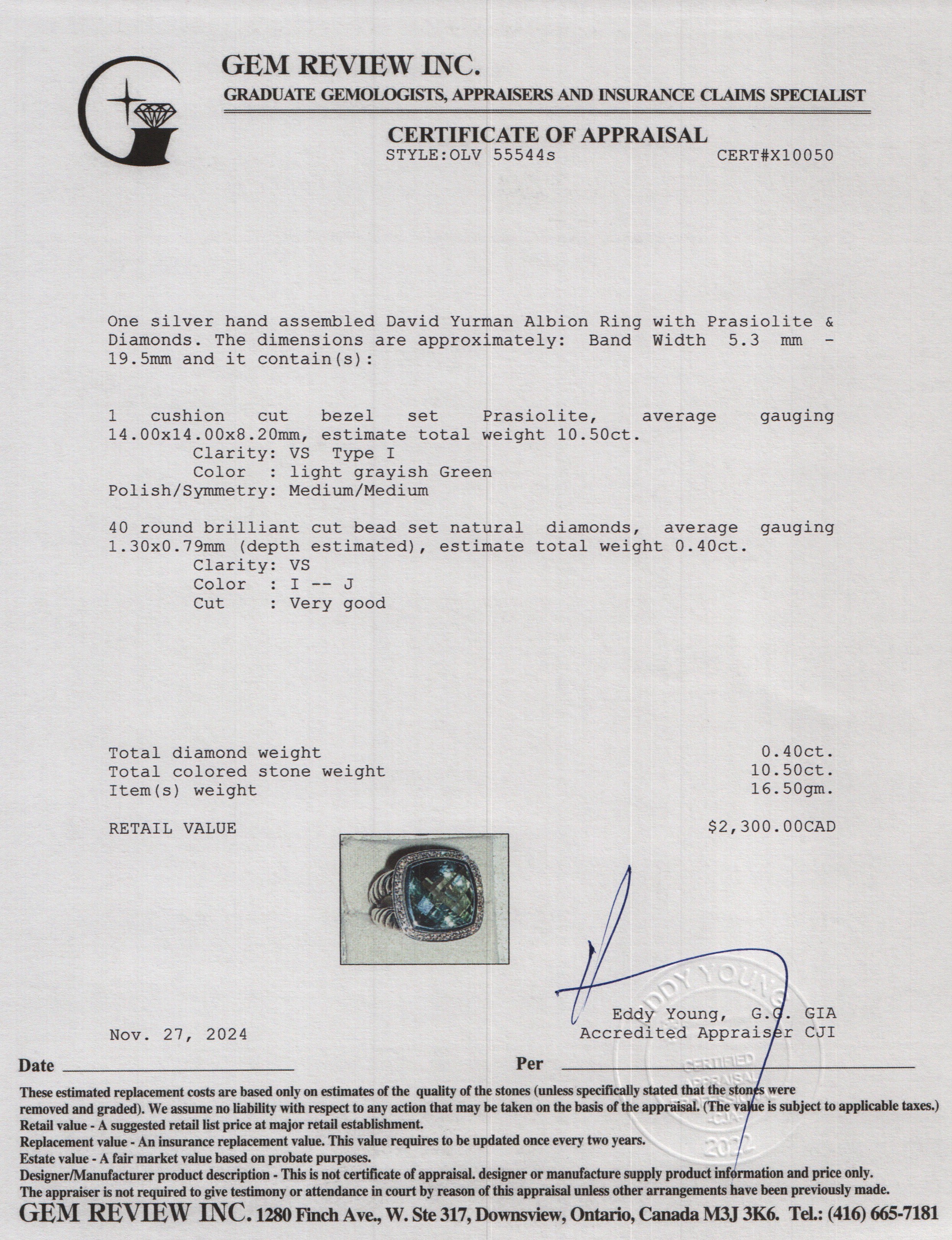Sterling Silver Albion Ring with Prasiolite & Diamonds, 14 MM Size 6.75