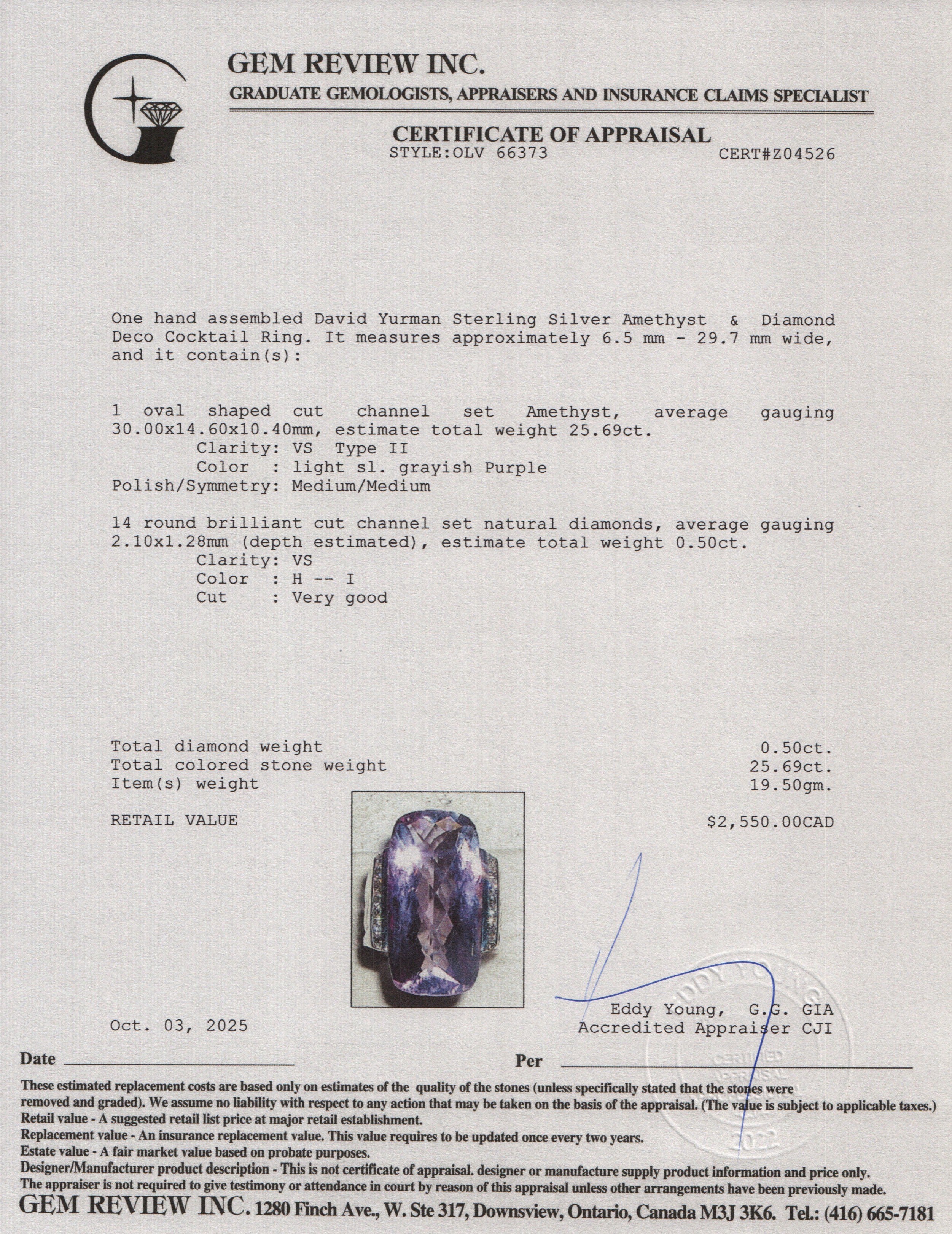 Sterling Silver Amethyst & Diamond Deco Cocktail Ring, Size 6