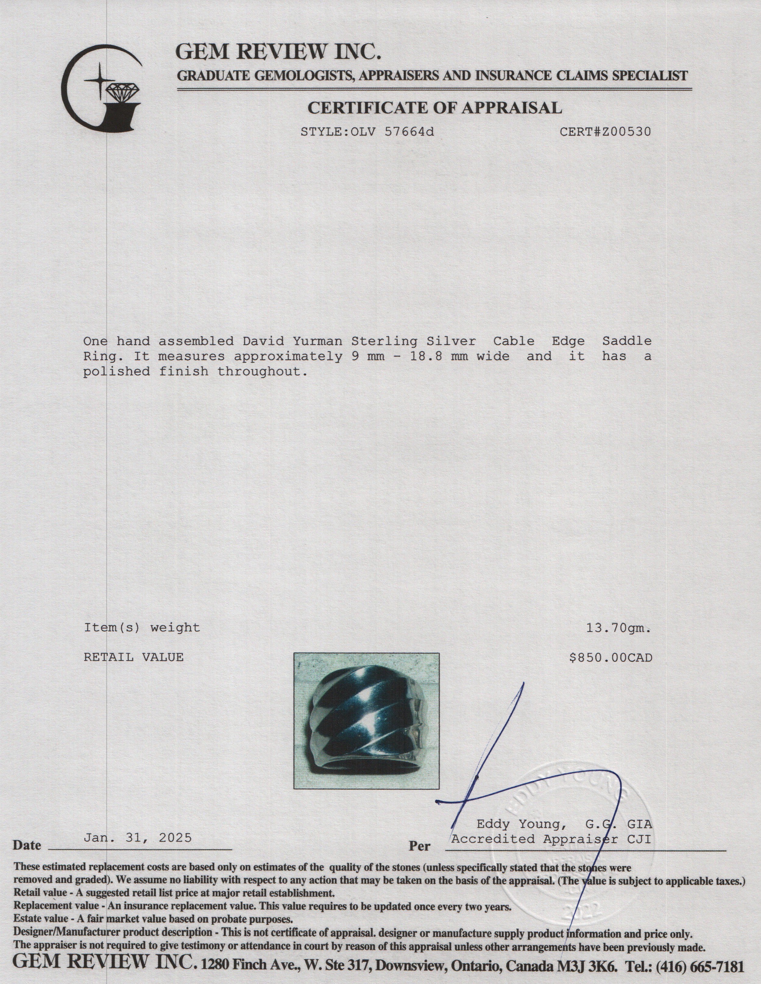 Sterling Silver Cable Edge Saddle 18.8 MM Ring, Size 7
