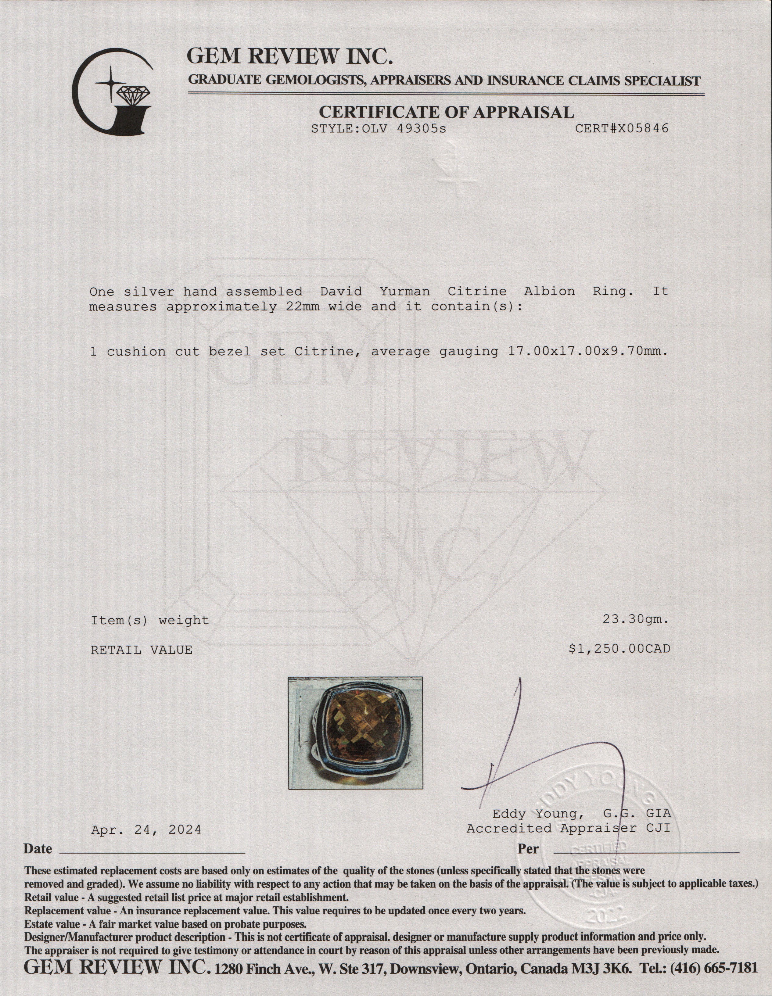 Sterling Silver Citrine Albion Ring, Size 7.75