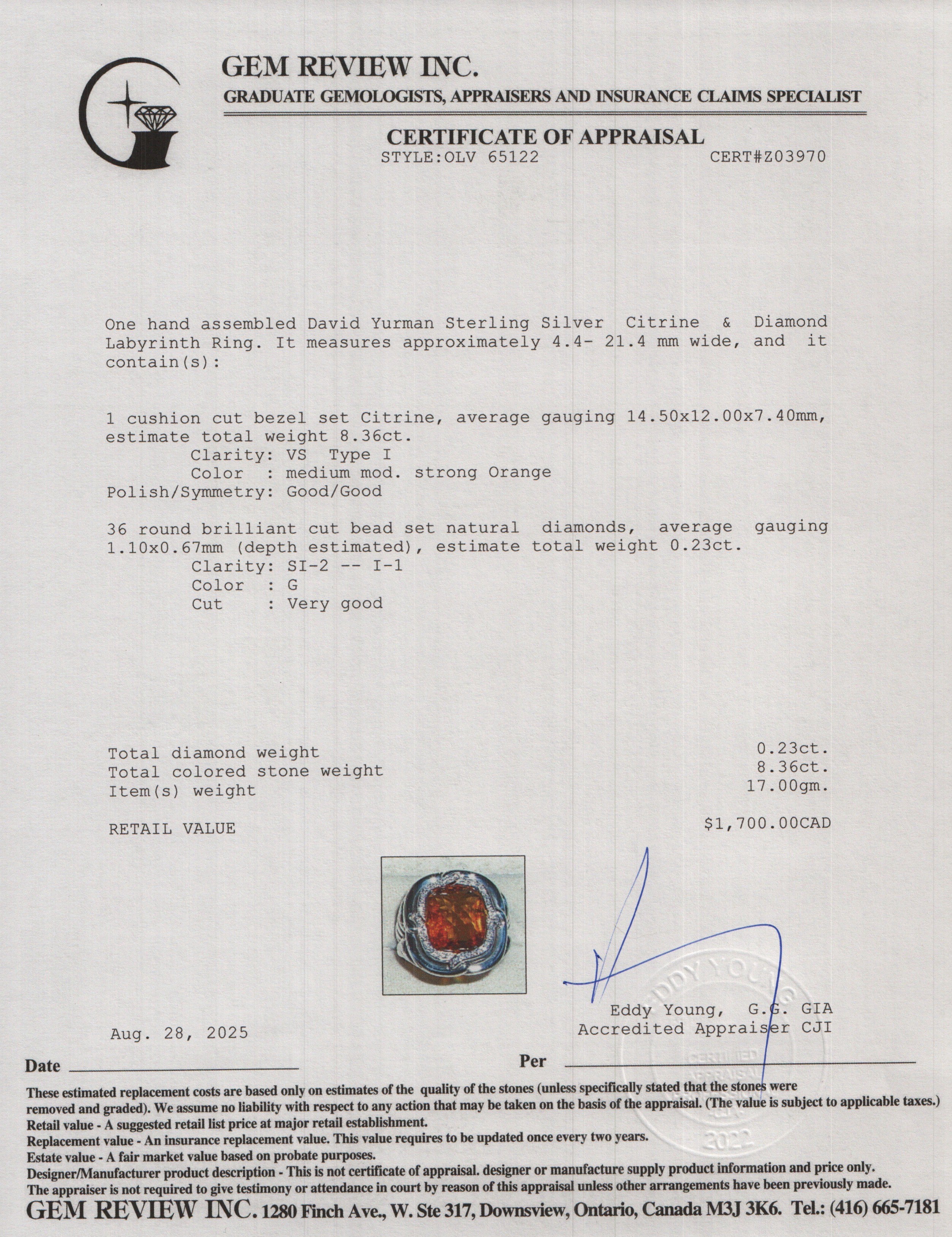 Sterling Silver Citrine & Diamond Labyrinth Ring, Size 7.25