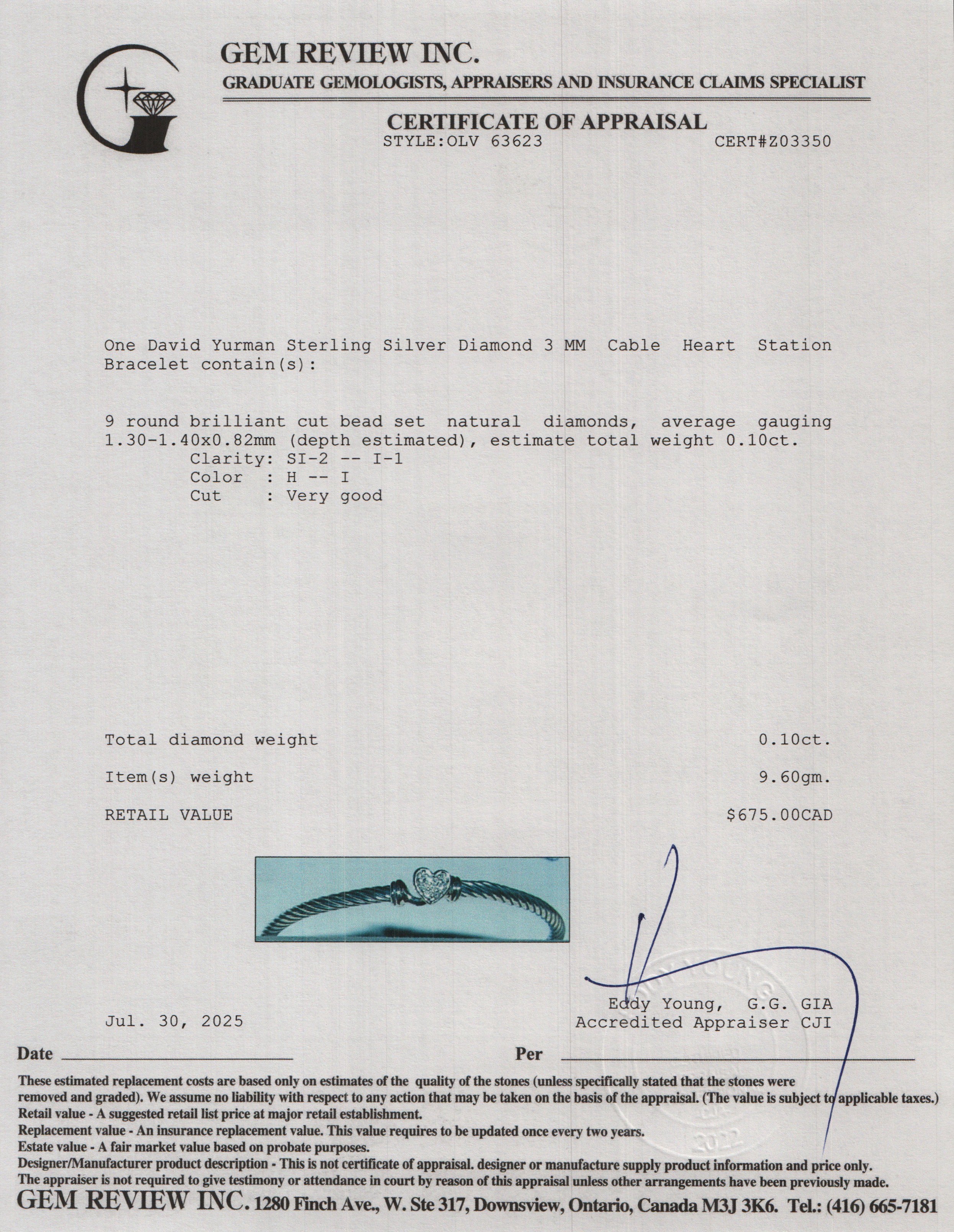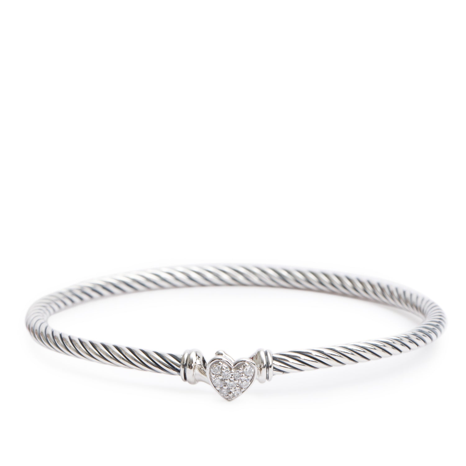 Sterling Silver Diamond 3 MM Cable Heart Station Bracelet