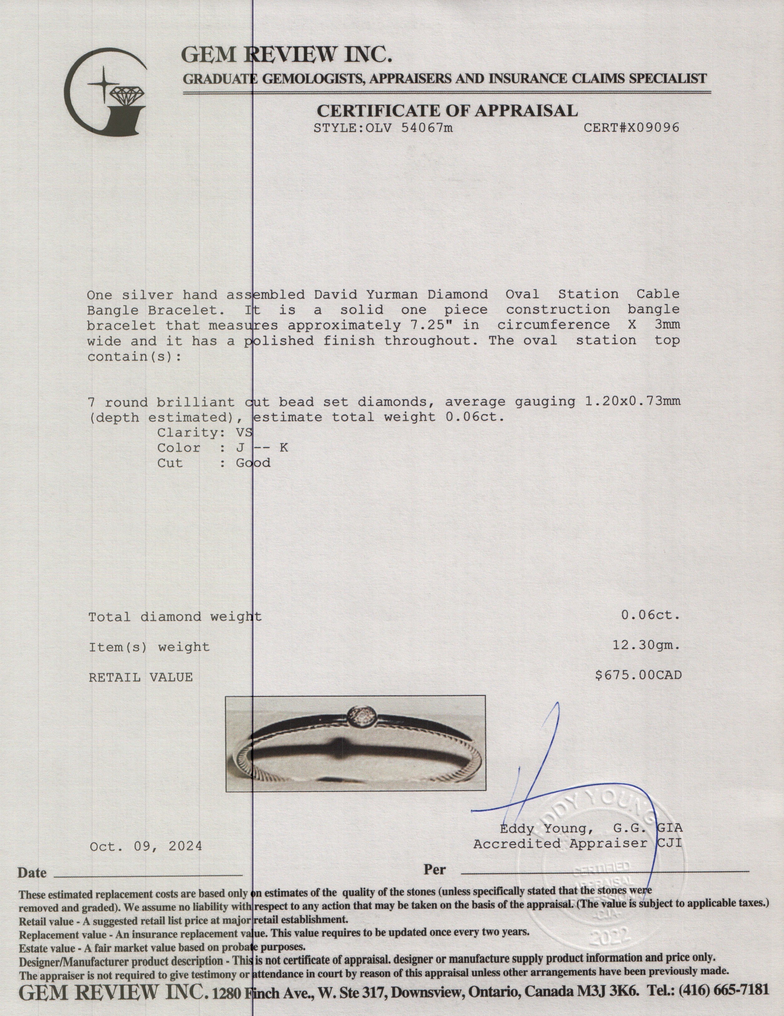 Sterling Silver Diamond Oval Station 3 MM Cable Bangle Bracelet