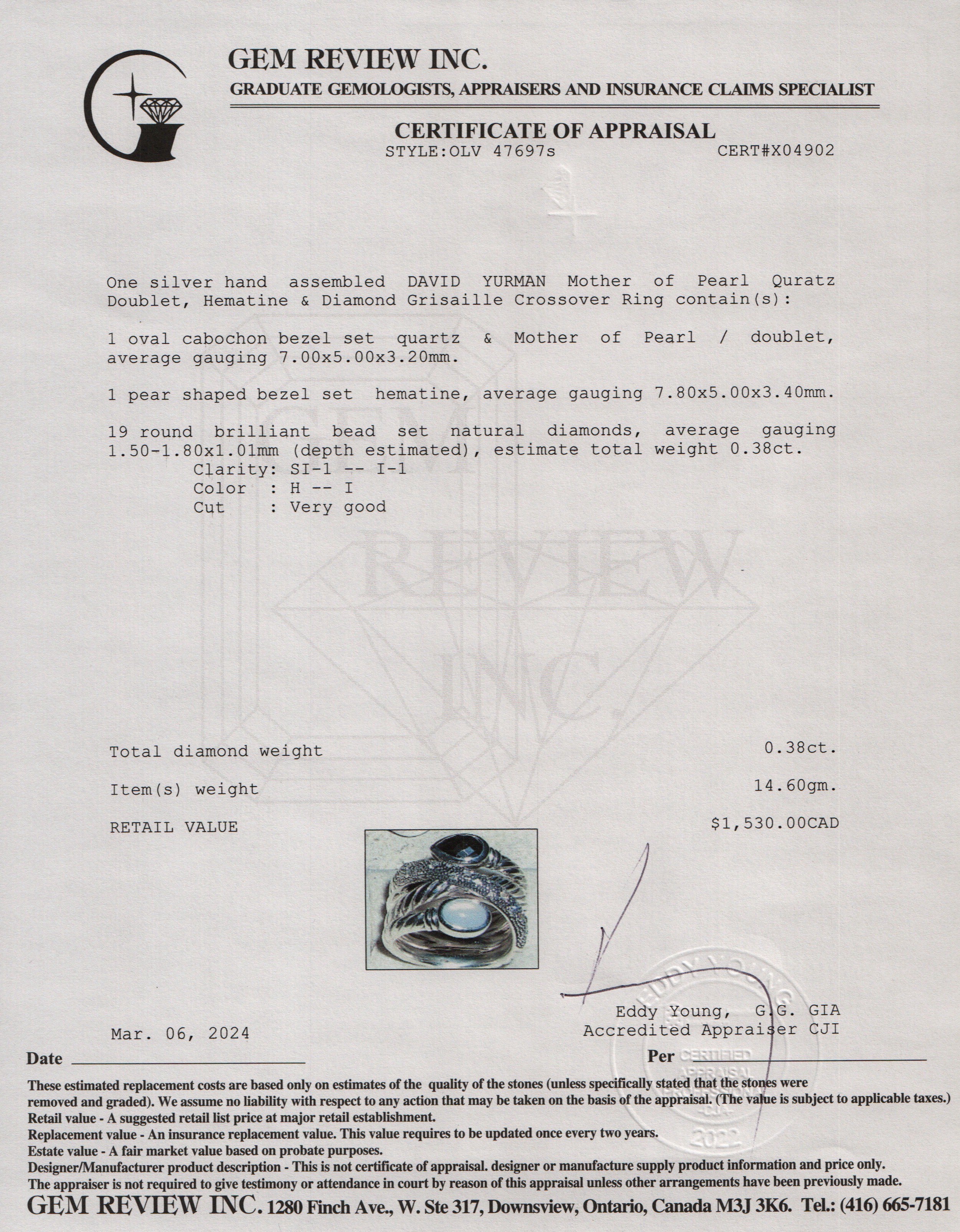 Sterling Silver Mother of Pearl Quartz Doublet, Hematine & Diamond Grisaille Crossover Ring, Size 8