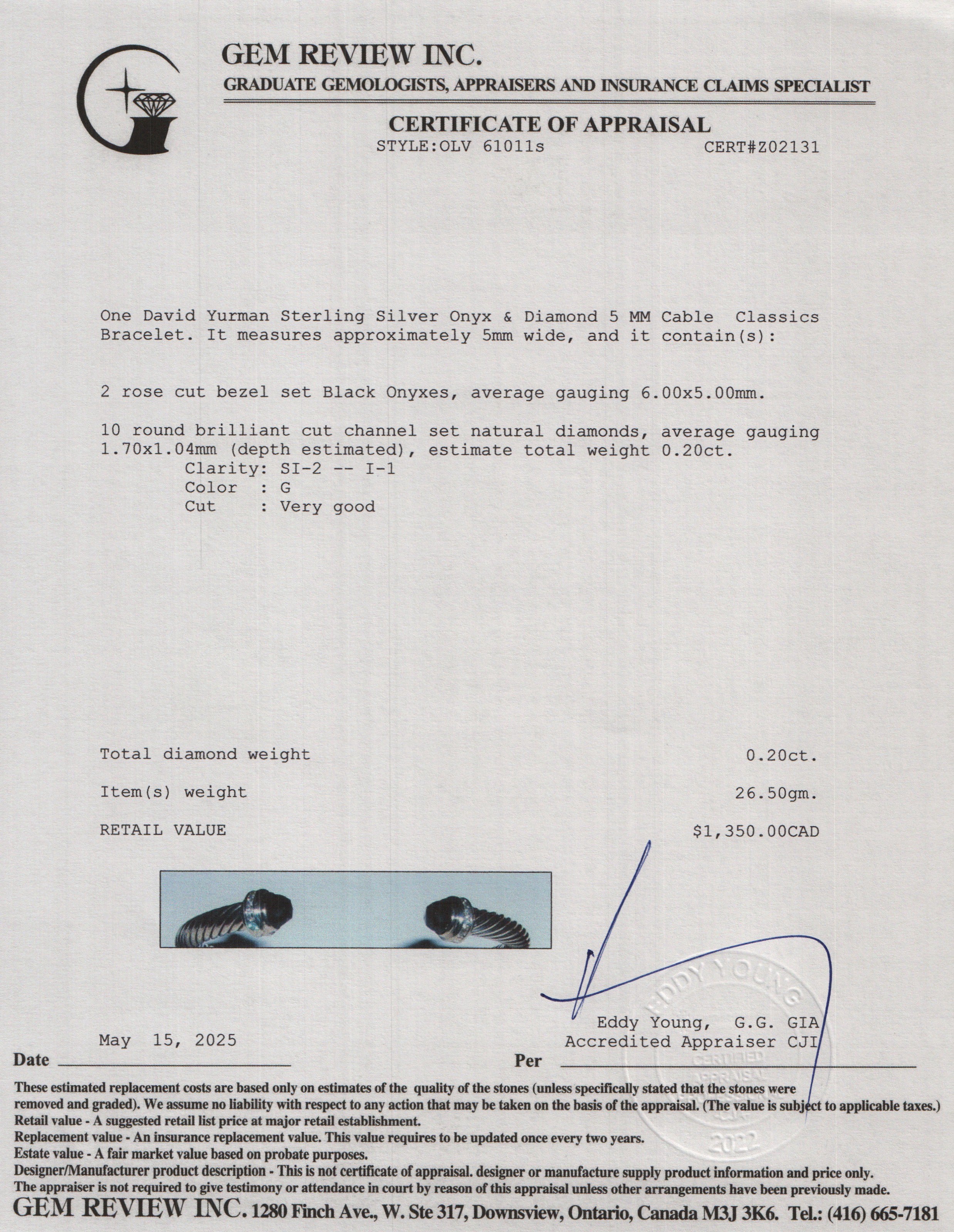 Sterling Silver Onyx & Diamond 5 MM Cable Classics Bracelet w/ Box