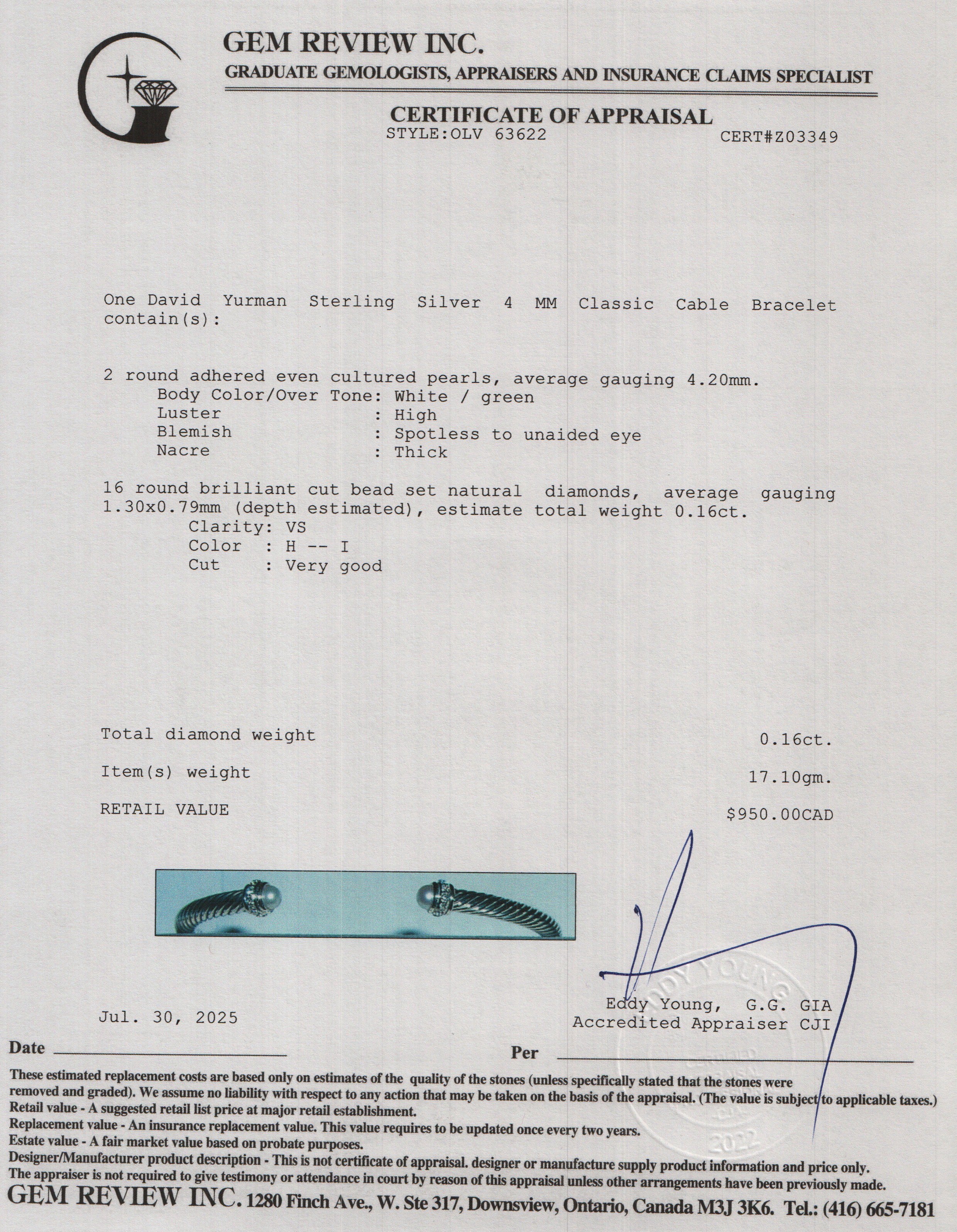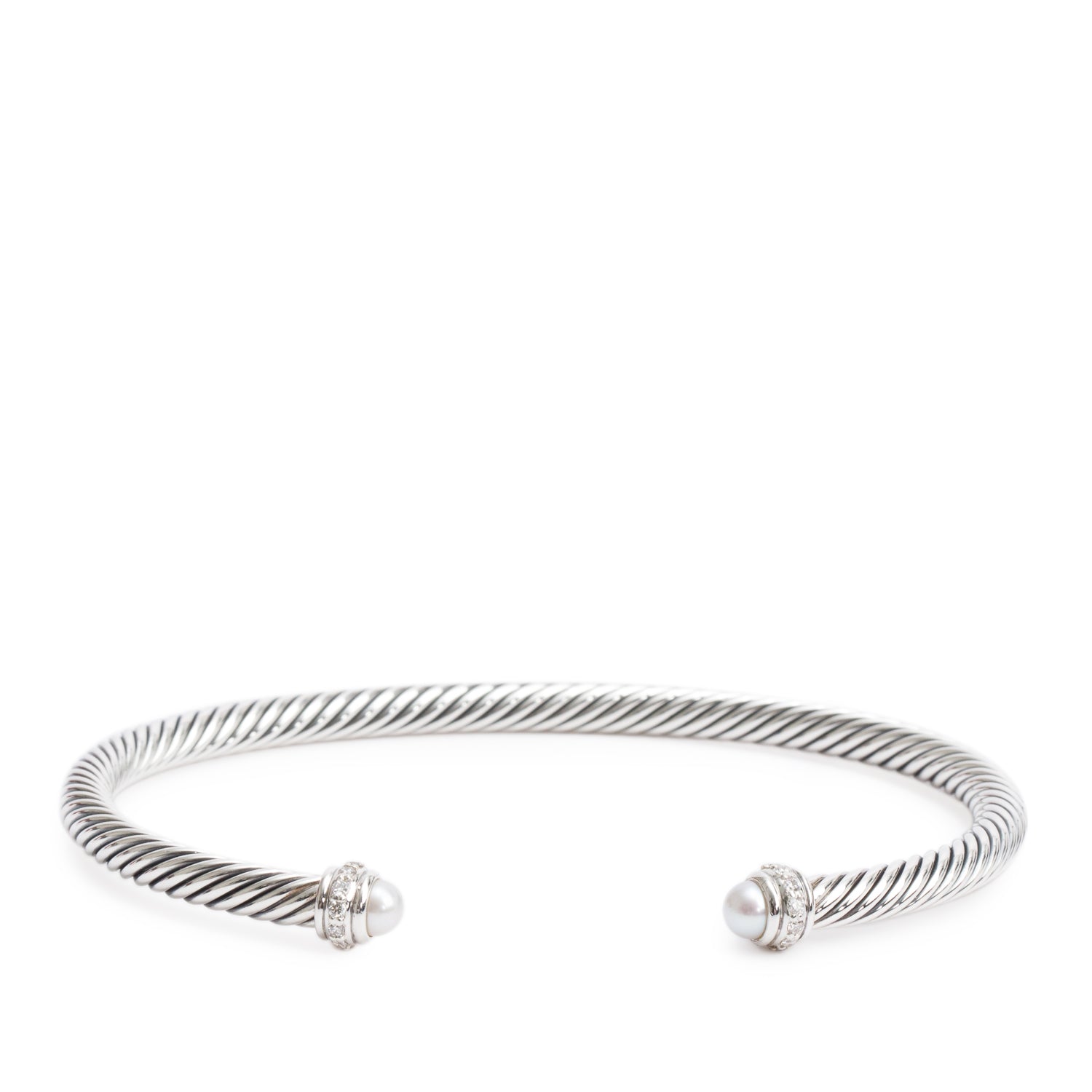 Sterling Silver Pearl & Diamond 4 MM Classic Cable Bracelet