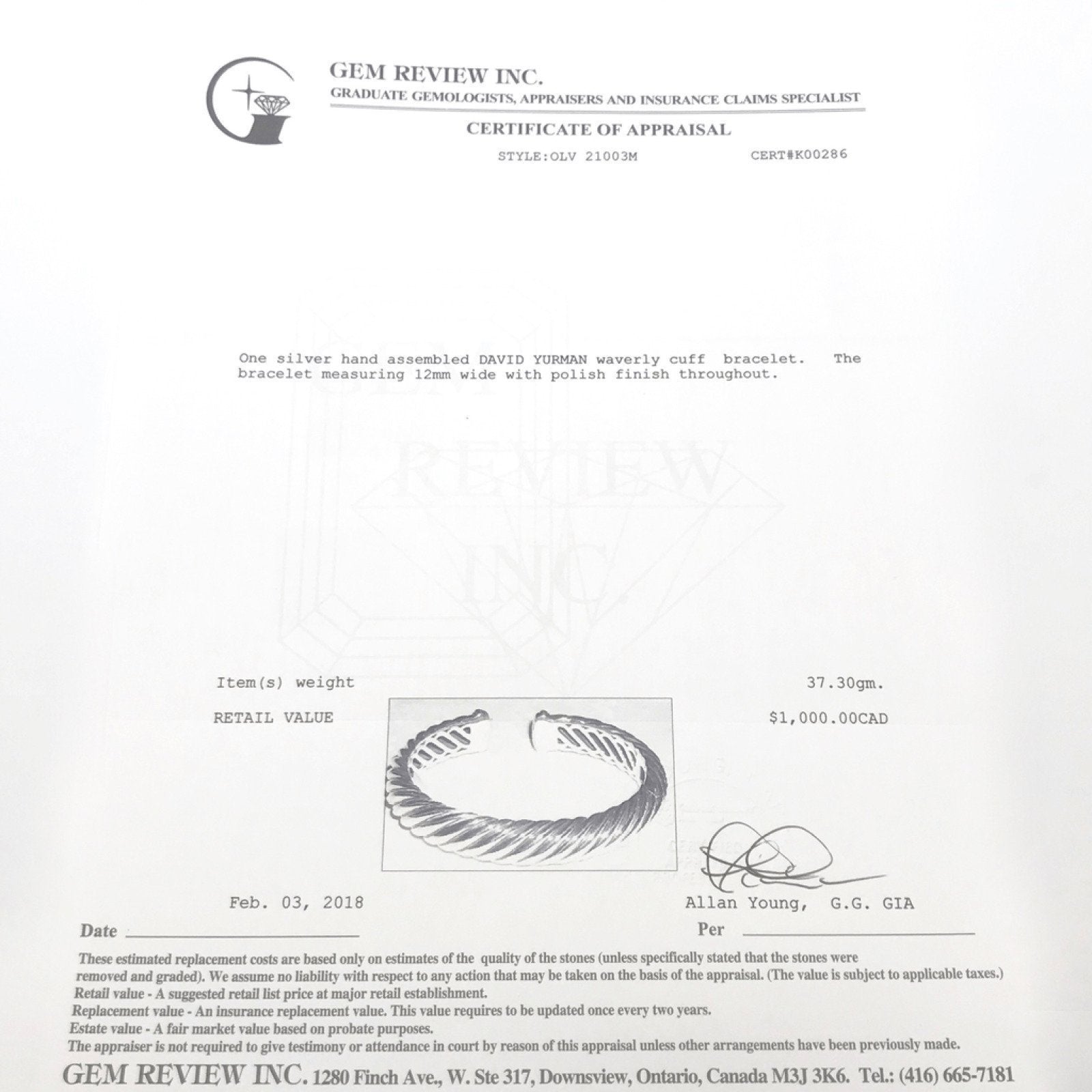 David Yurman Waverly Cuff Bracelet in Sterling Silver, Measuring 12mm Wide, Comes with Gem Review Appraisal
