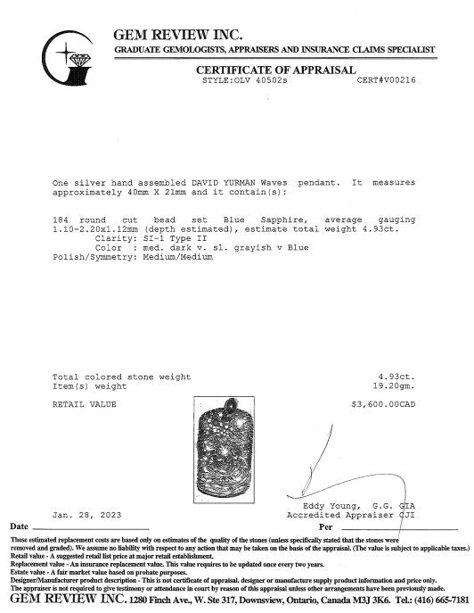 David Yurman Waves Dog Tag Pendant with Blue Sapphires