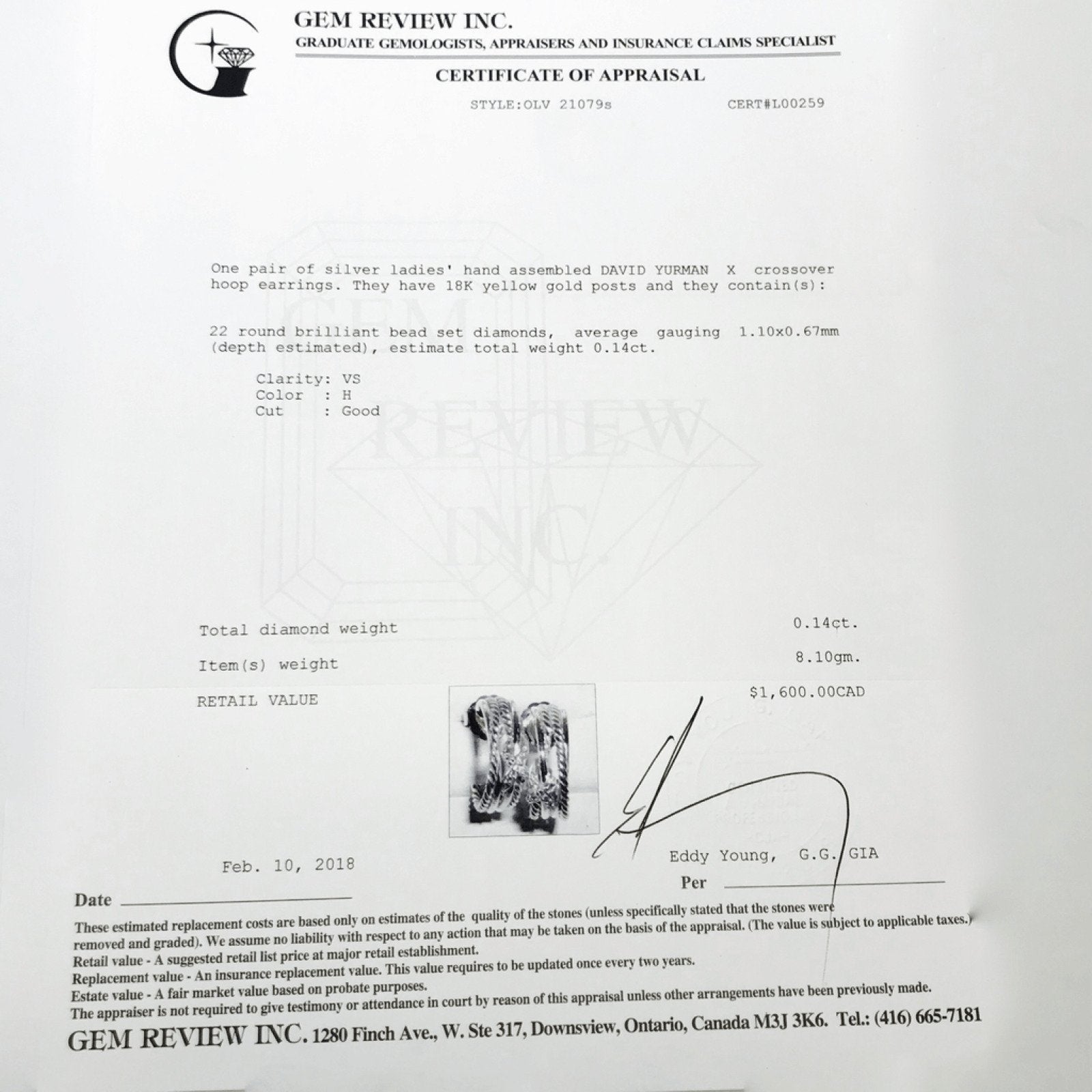 David Yurman X Crossover Hoop Earrings in Sterling Silver with Diamonds (0.14 TCW) and 18K Yellow Gold Posts, Comes with Gem Review Appraisal