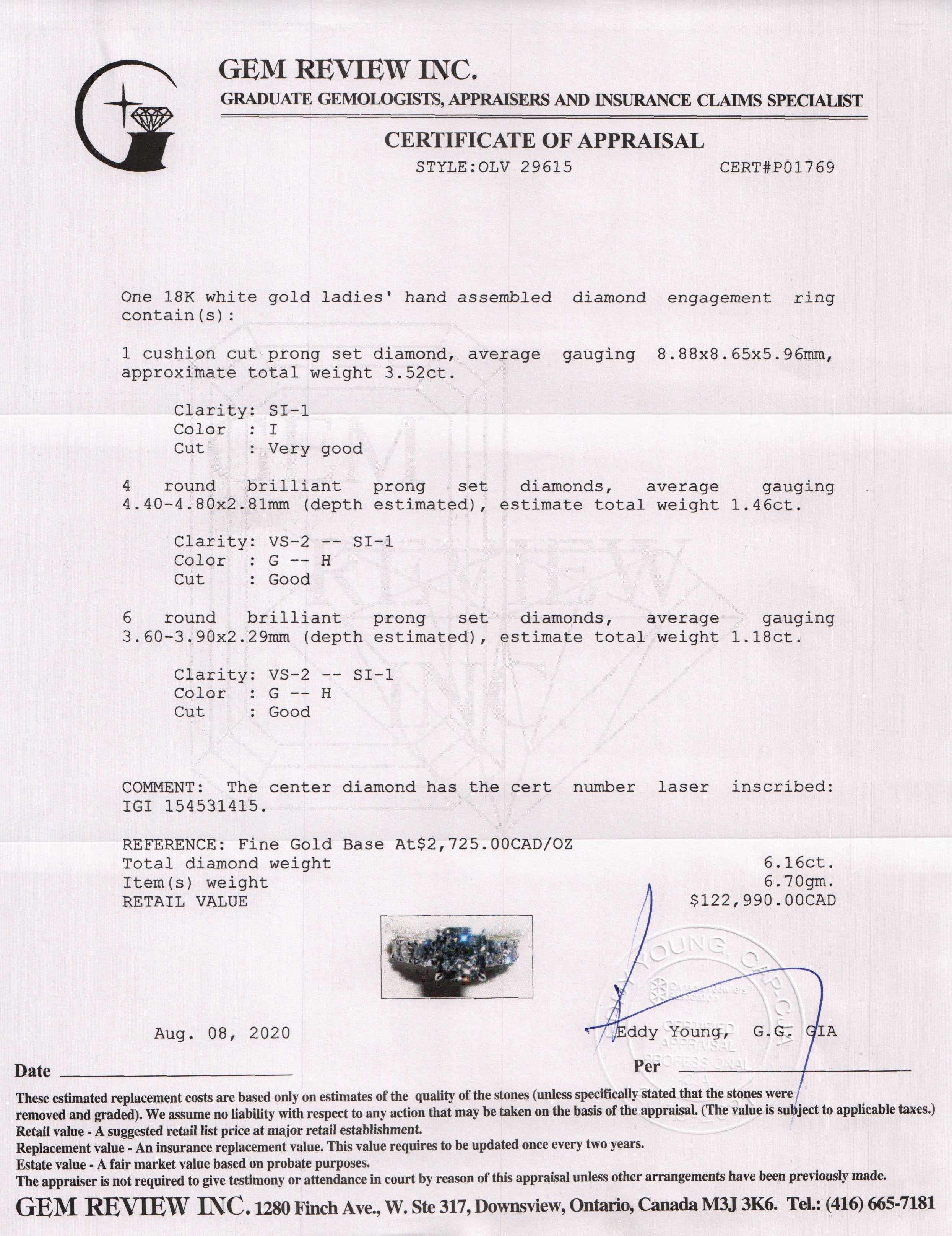 - 1 Cushion Cut Diamond Weighing Approximately 3.52 ct. of SI1 Clarity, I Colour, Very Good Cut