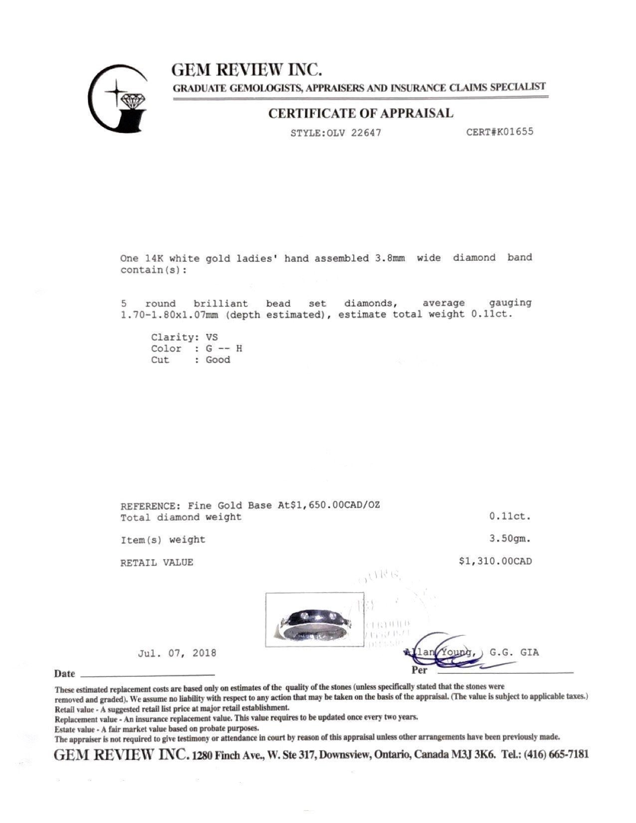 - 5 Round Brilliant Cut Diamonds Totalling Approximately 0.11 ct. of VS Clarity, G-H Colour, Good Cut