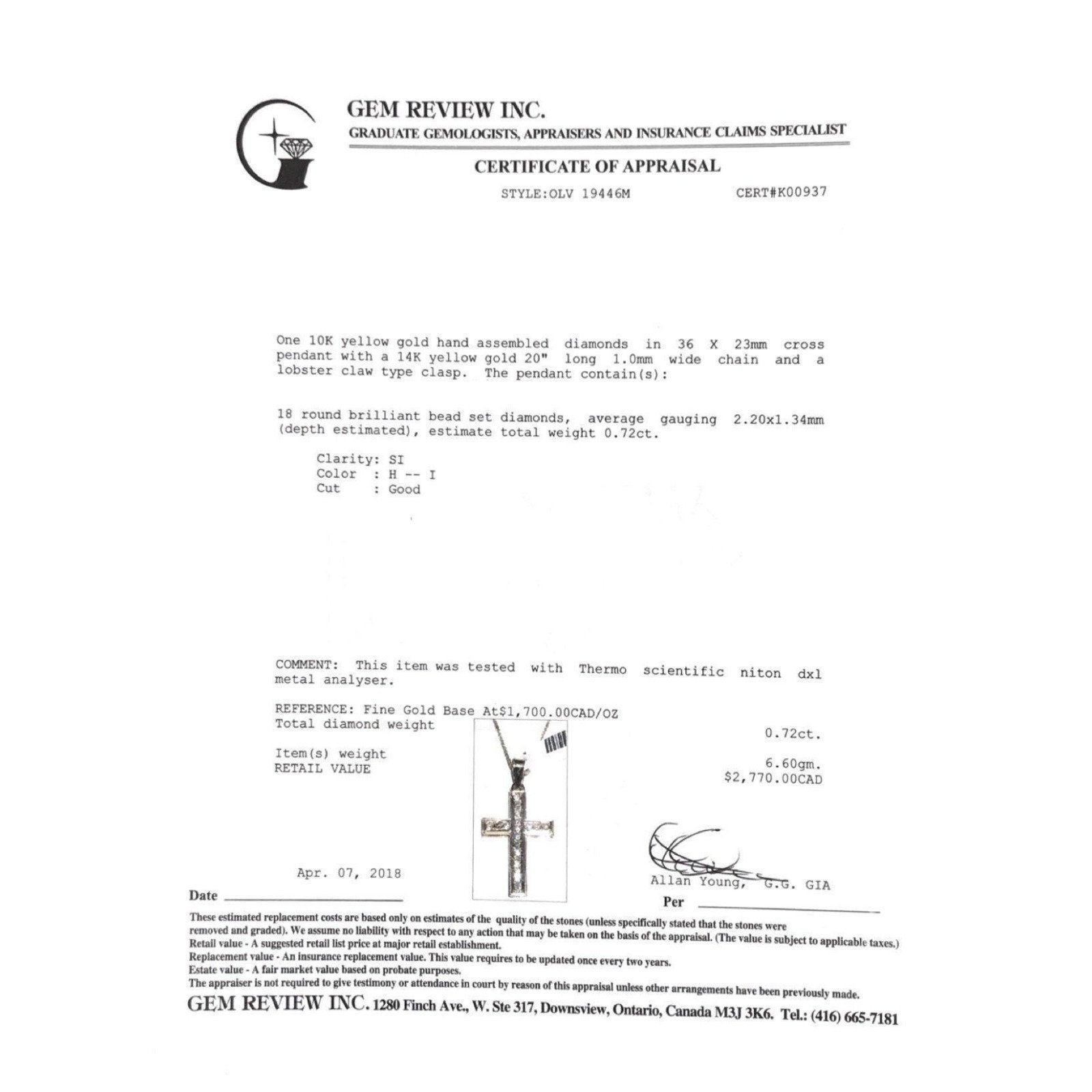 Diamond Cross Pendant in 10kt Yellow Gold; Approximately 0.72 Total Diamond Carat Weight, SI Clarity, H-I Colour; Comes with $2,285 Gem Review Appraisal