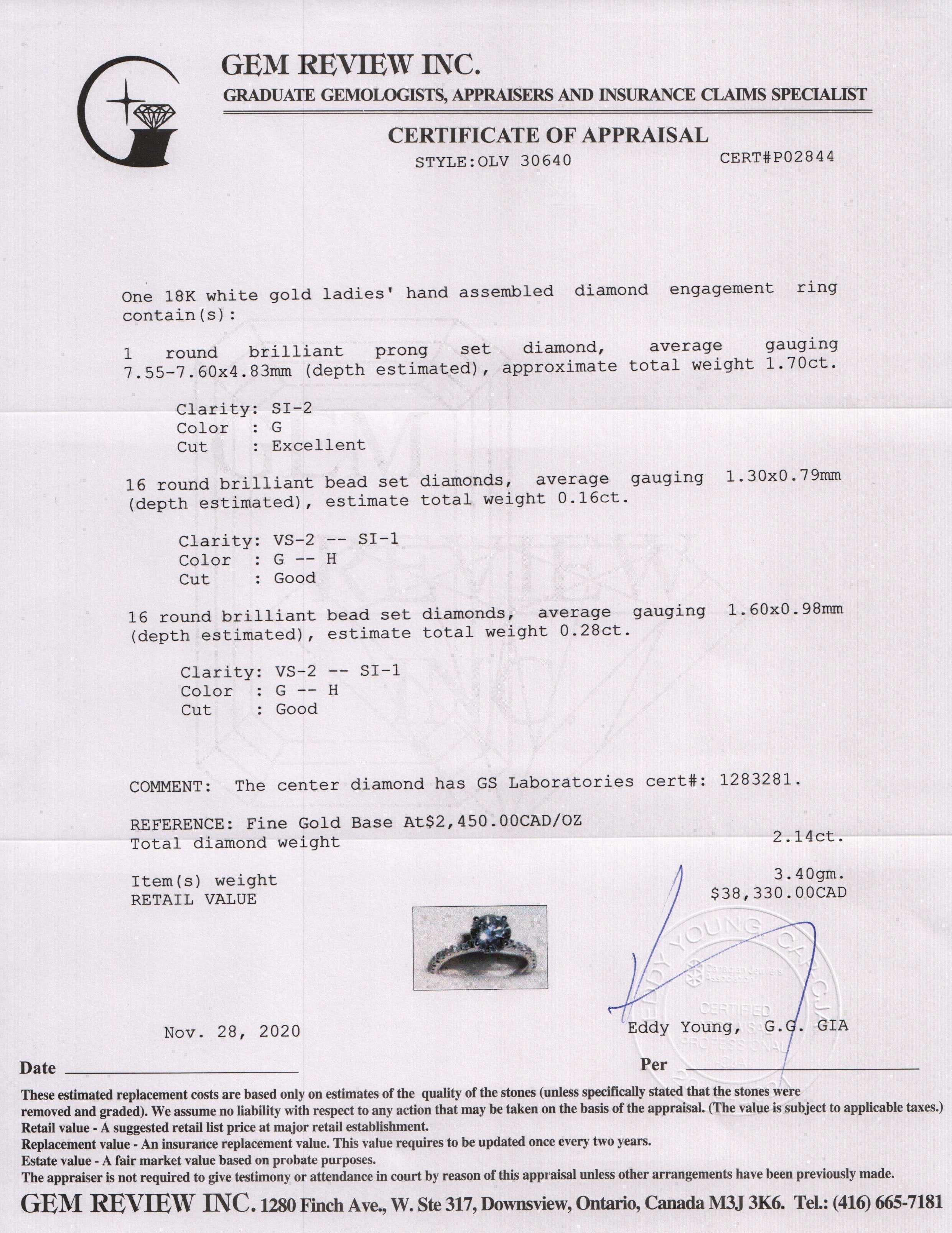 - 1 Round Brilliant Cut Diamond Weighing Approximately 1.70 ct. of SI2 Clarity, G Colour, Excellent Cut