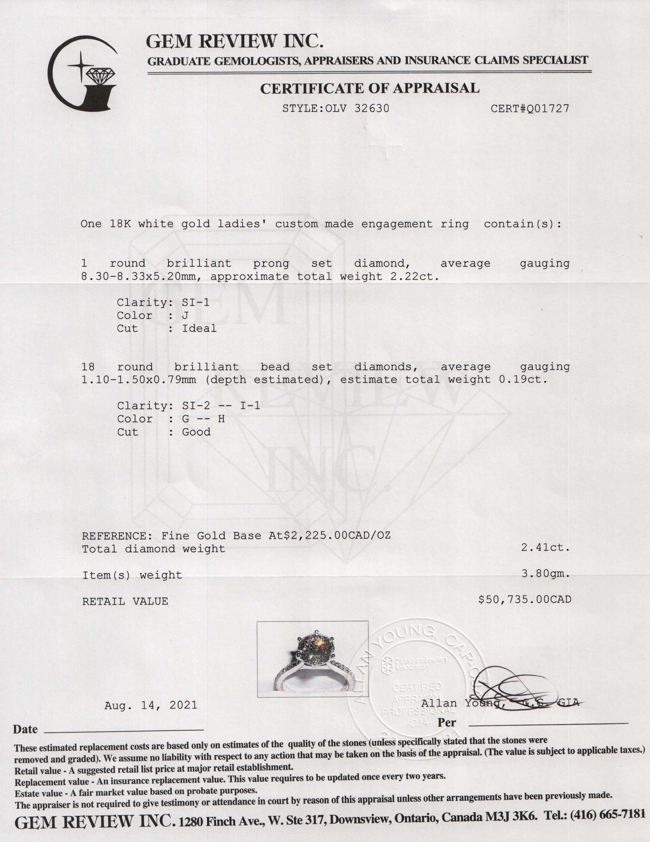 - 1 Round Brilliant Cut Diamond Weighing Approximately 2.22 ct. of SI1 Clarity, J Colour, Ideal Cut