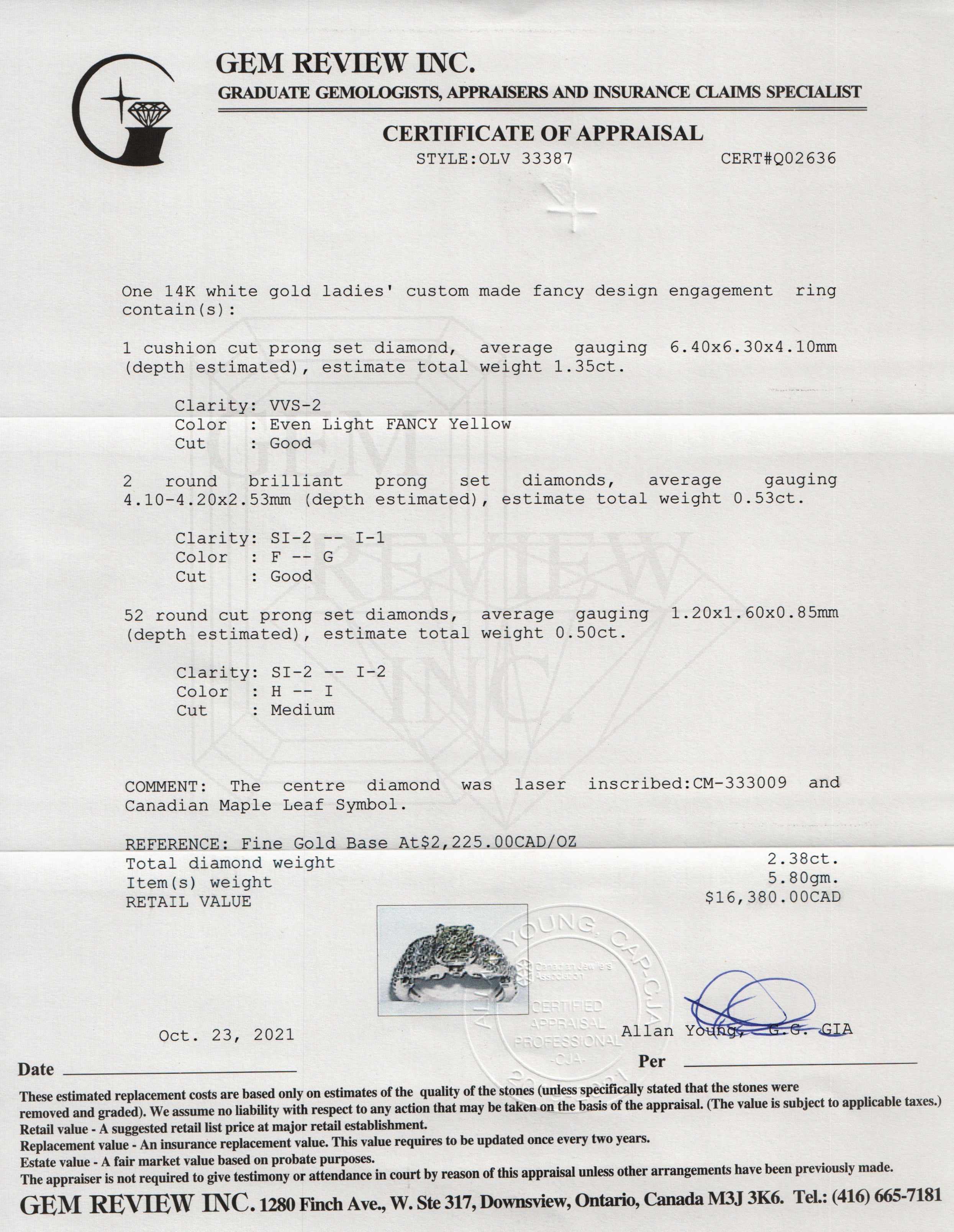- 1 Cushion Cut Diamond Weighing Approximately 1.35 ct. of VVS2 Clarity, Even Light Fancy Yellow Colour, Good Cut