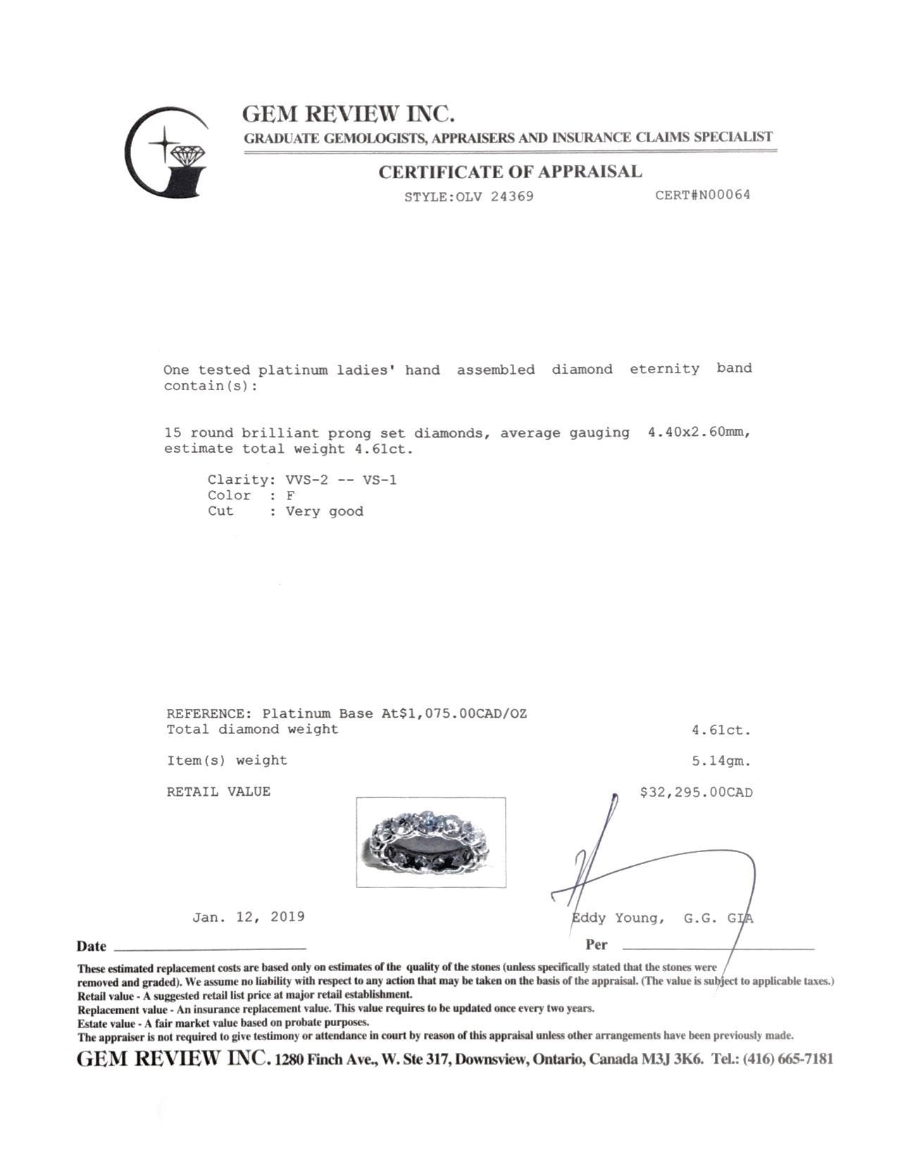 - 15 Round Brilliant Cut Diamonds Totalling Approximately 4.61 ct. of VVS2-VS1 Clarity, F Colour, Very Good Cut