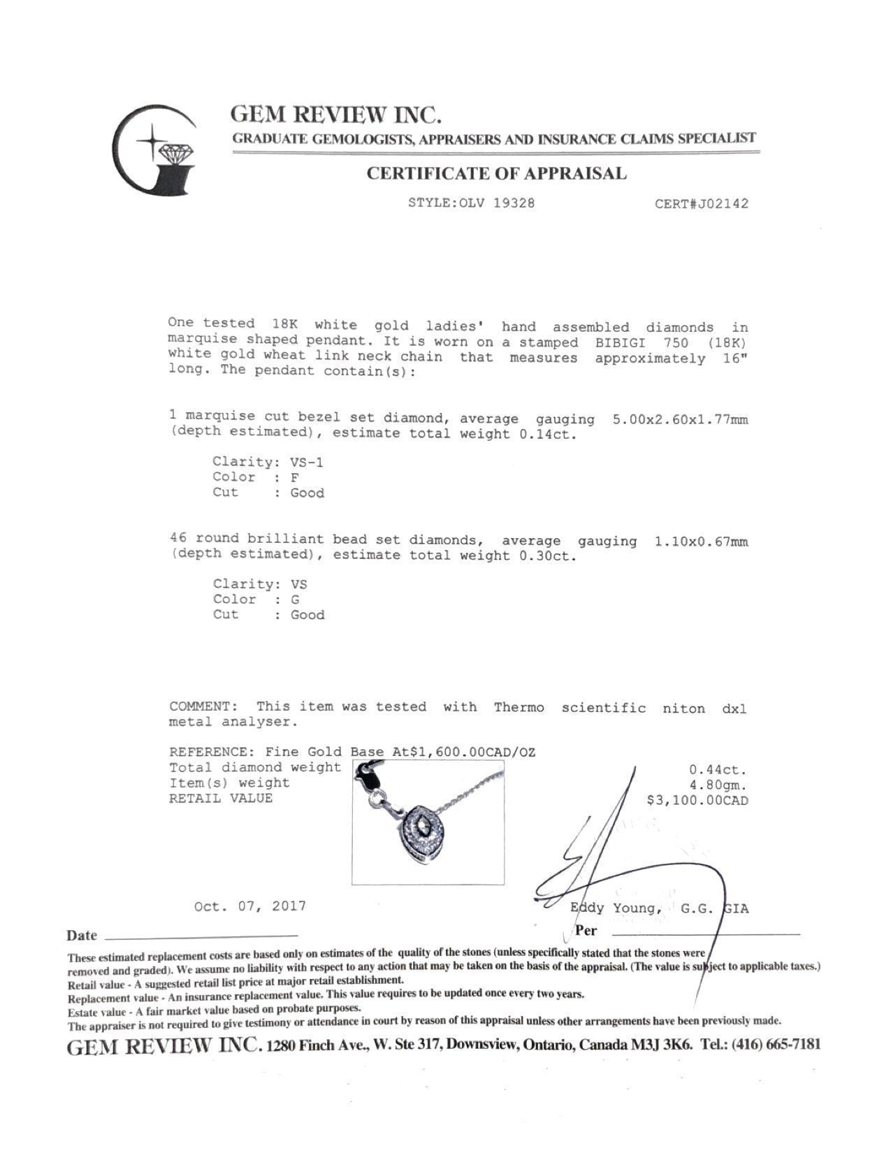 DIamond Pendant on a 16” Chain in 18kt White Gold; Approximately 0.44 Total Diamond Carat Weight, VS Clarity, F-G Colour; Comes with $3,100 Gem Review Appraisal