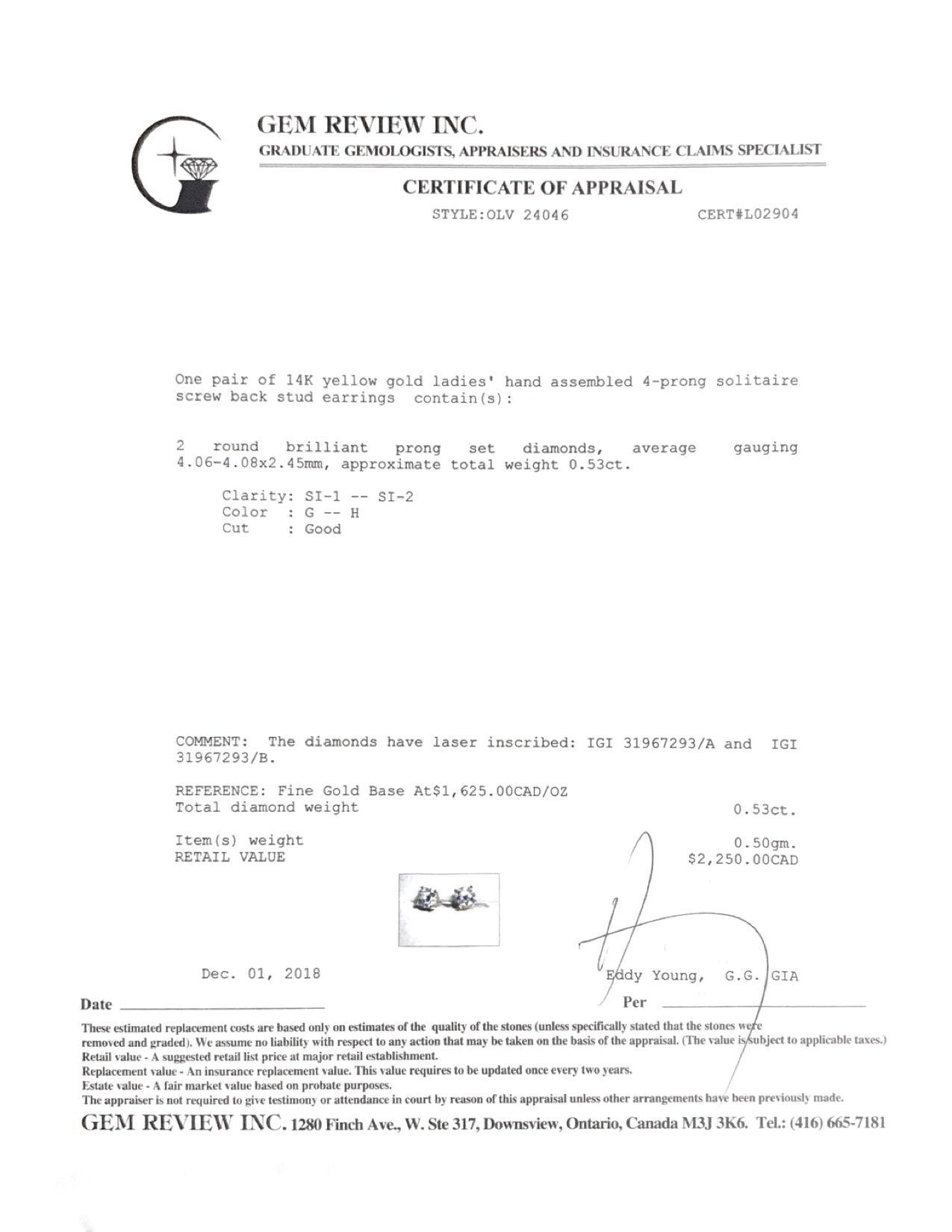 - 2 Round Brilliant Cut Diamonds Totalling Approximately 0.53 ct. of SI Clarity, G-H Colour, Good Cut