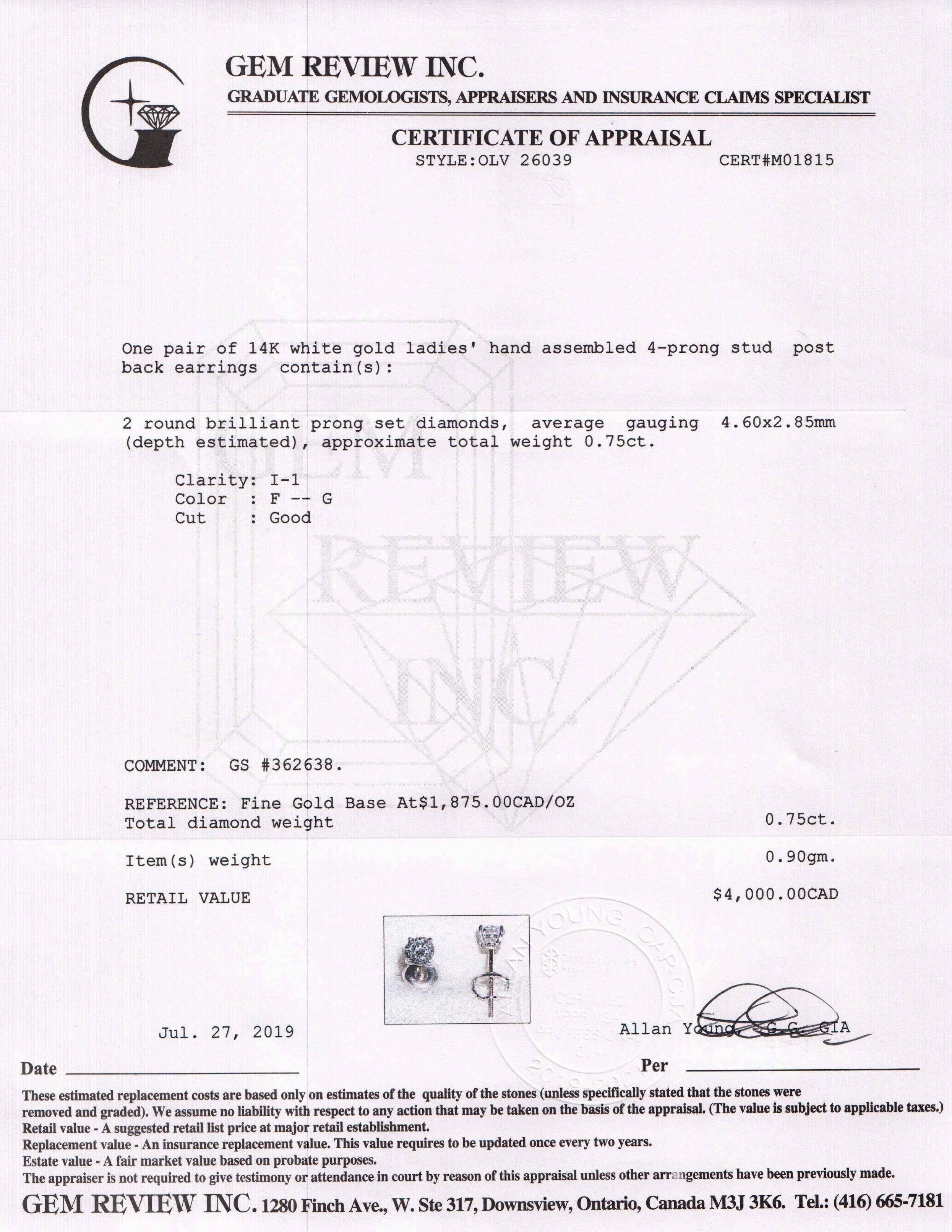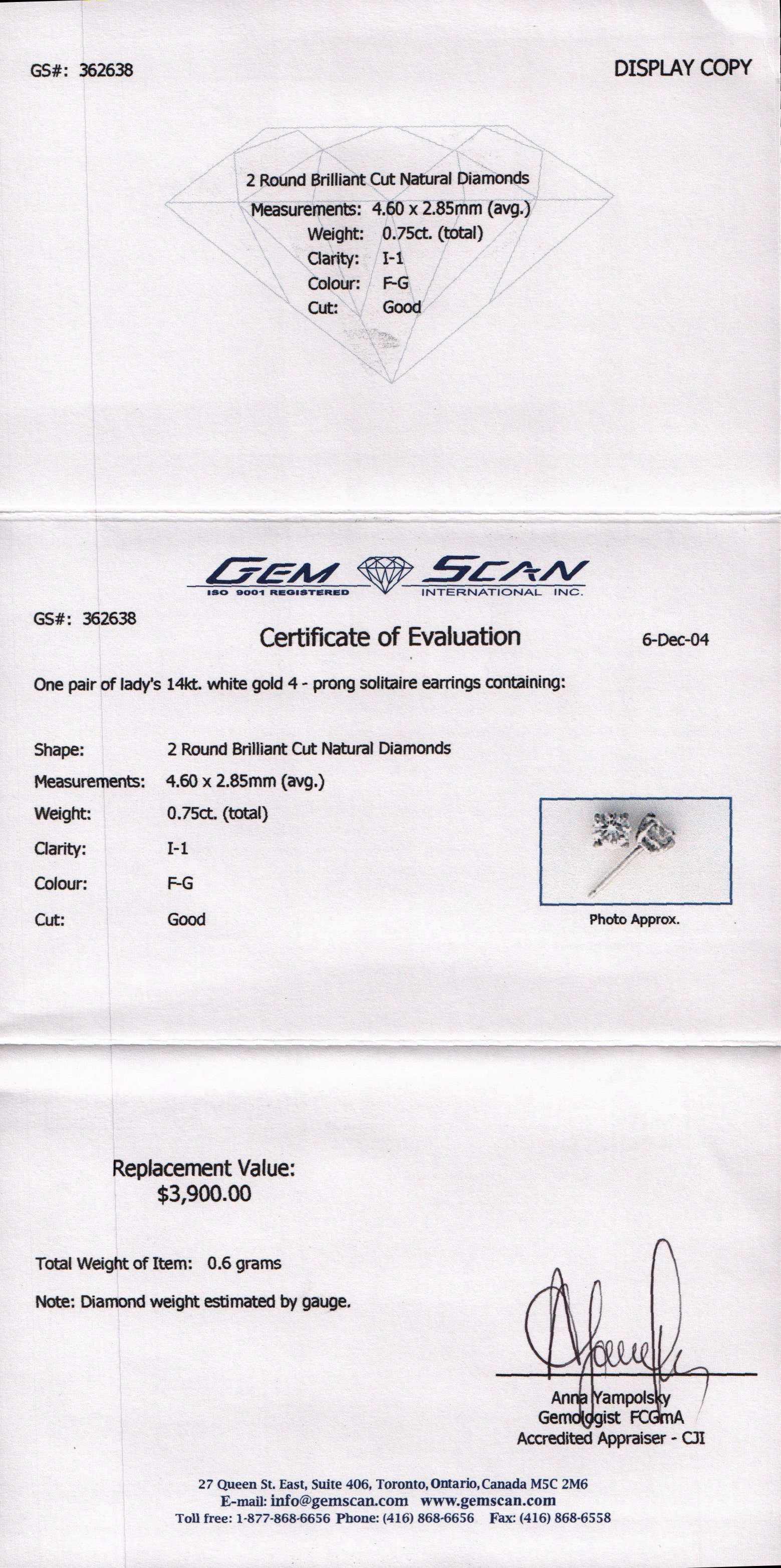 - 2 Round Brilliant Cut Diamonds Totalling Approximately 0.75 ct. of I1 Clarity, F-G Colour, Good Cut