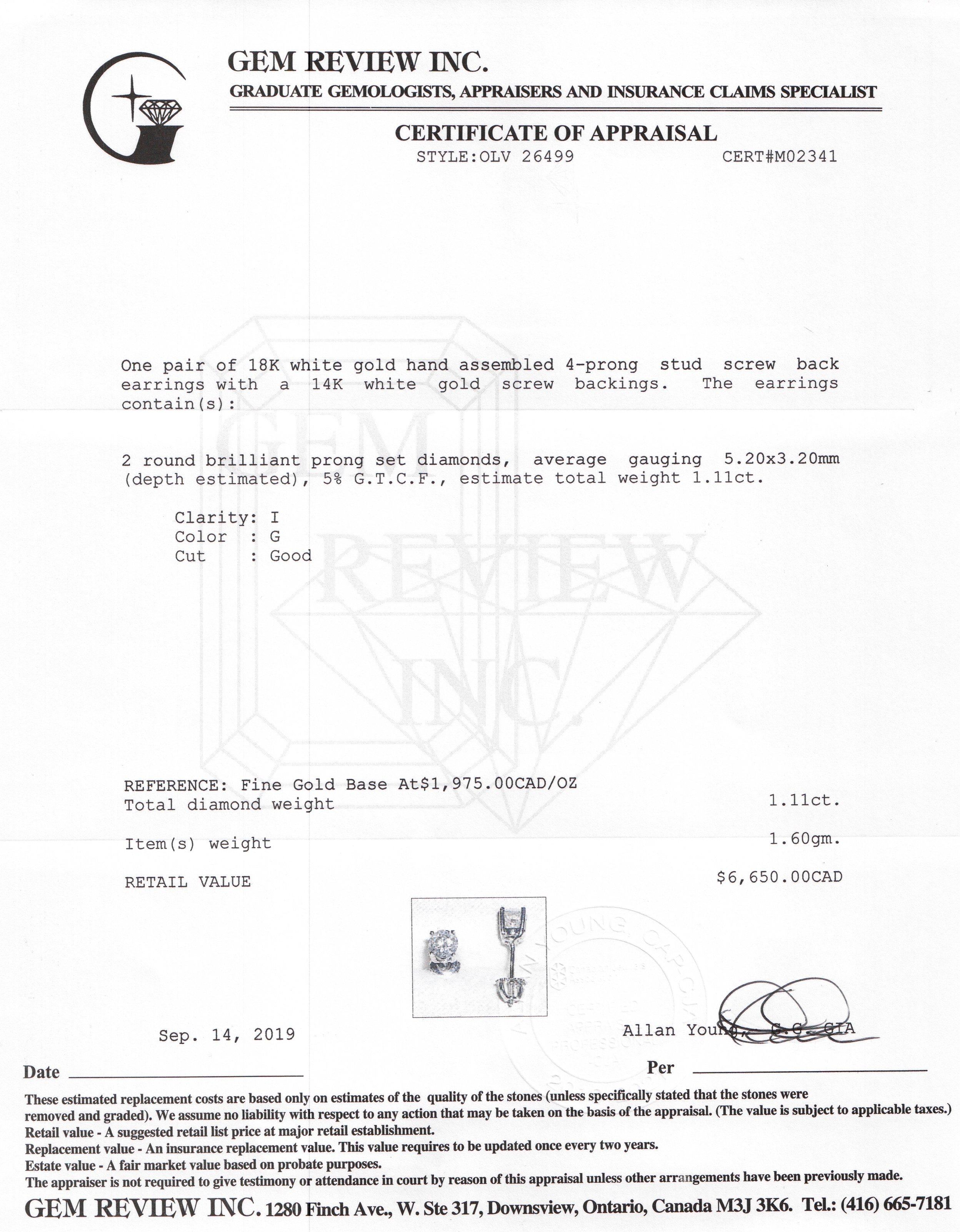 - 2 Round Brilliant Cut Diamonds Totalling 1.11 ct. of I Clarity, G Colour, Good Cut