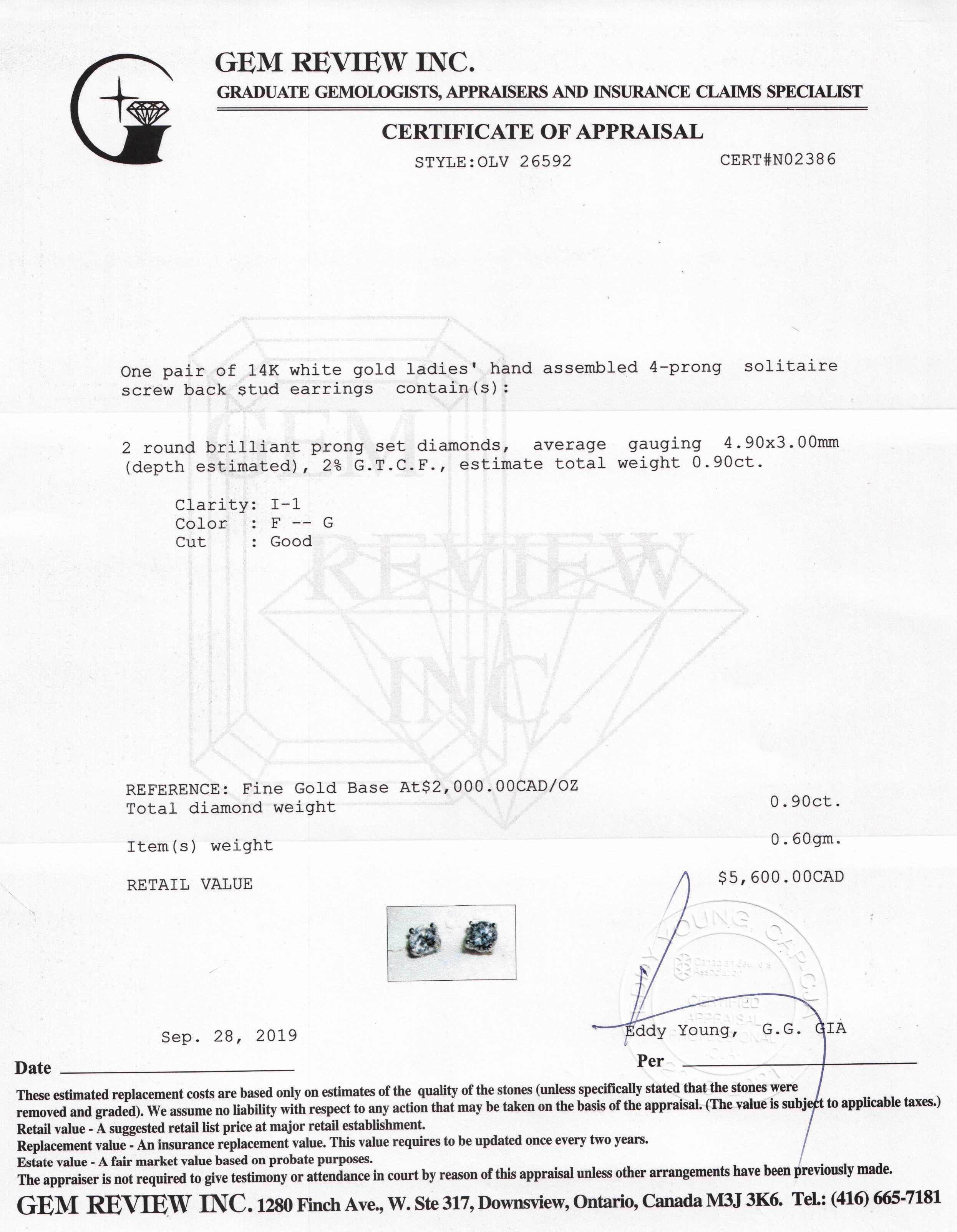 - 2 Round Brilliant Cut Diamonds Totalling 0.90 ct. of I1 Clarity, F-G Colour, Good Cut