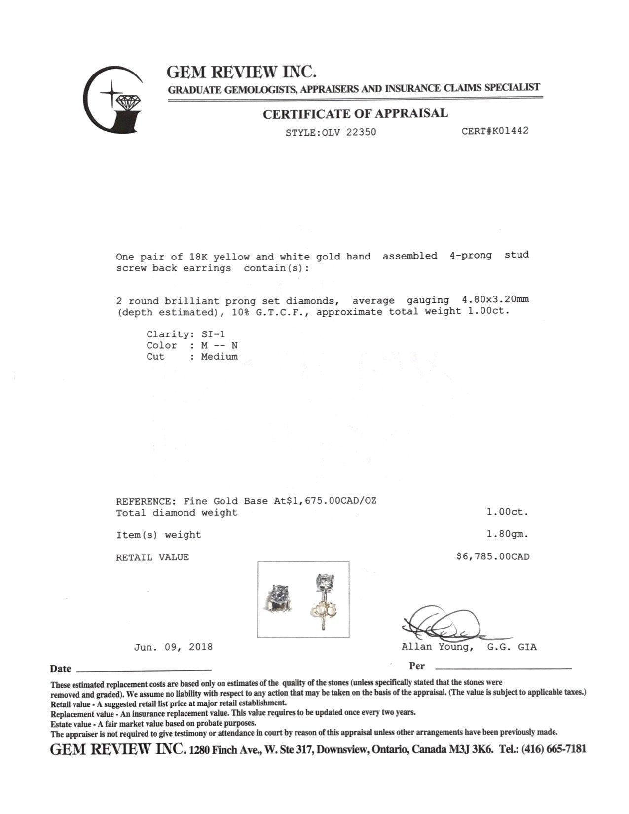 - 2 Round Brilliant Cut Diamonds Totalling Approximately 1.00 ct. of SI1 Clarity, M-N Colour, Medium Cut