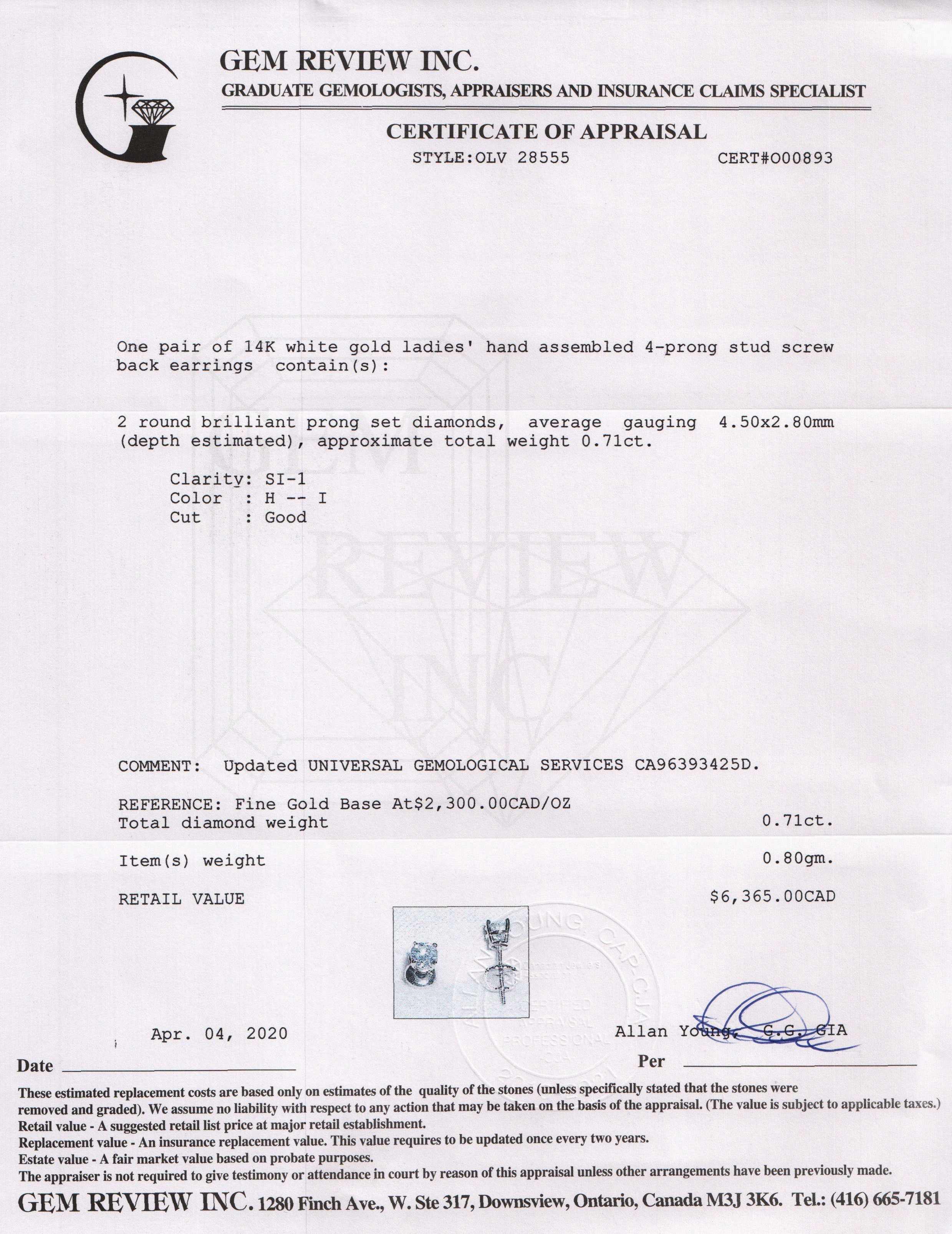 - 2 Round Brilliant Cut Diamond Weighing Approximately 0.71 ct. of SI1 Clarity, H-I Colour, Good Cut