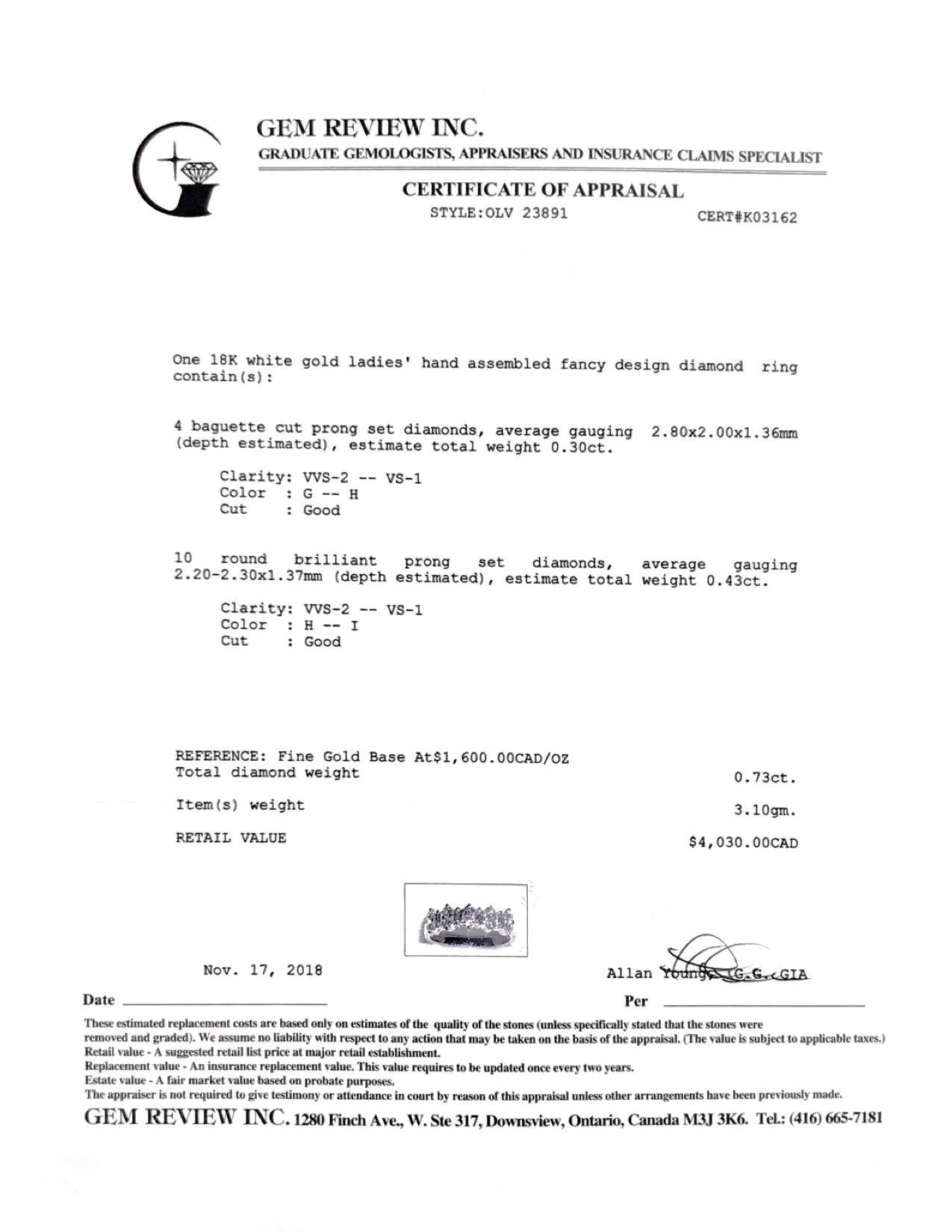 - 4 Baguette Cut Diamonds Totalling Approximately 0.30 ct. of VVS2-VS1 Clarity, G-H Colour, Good Cut