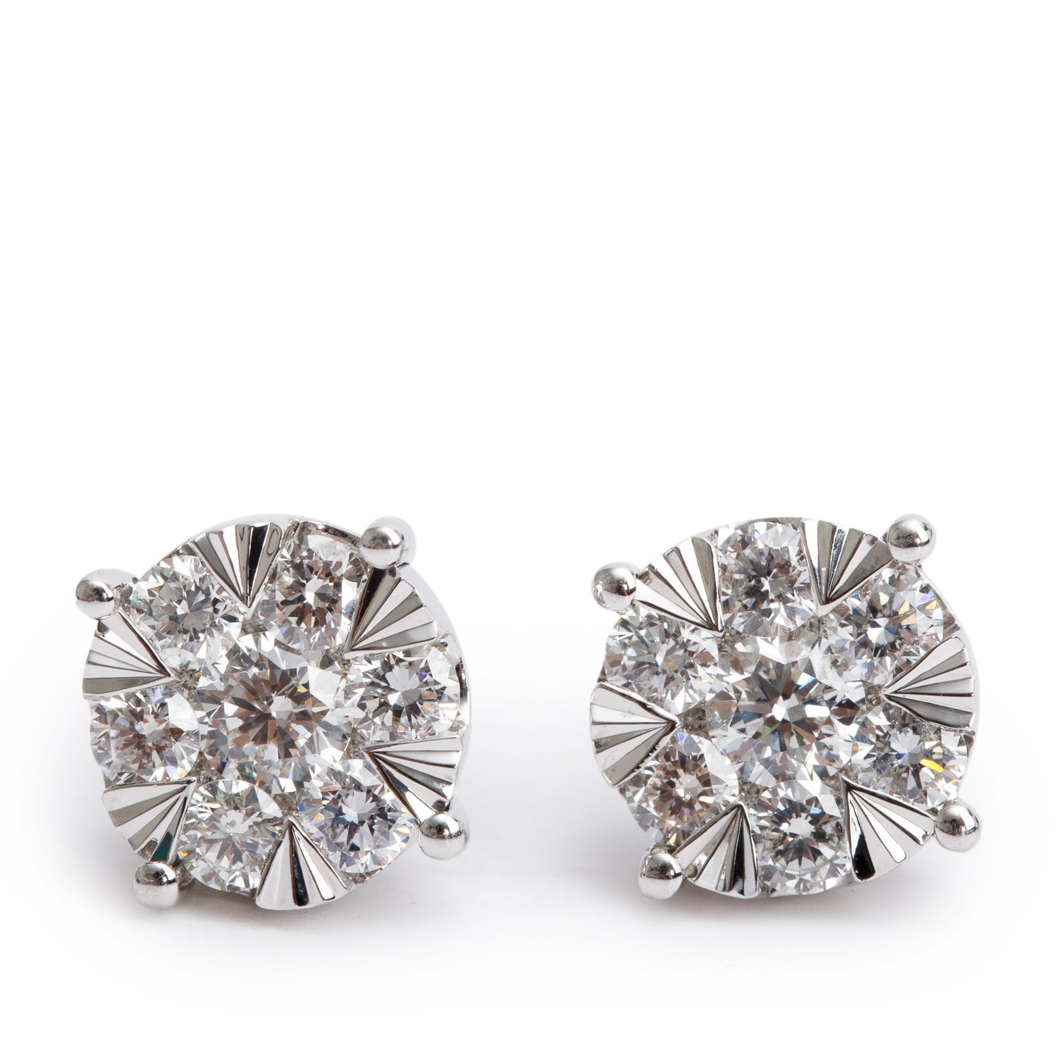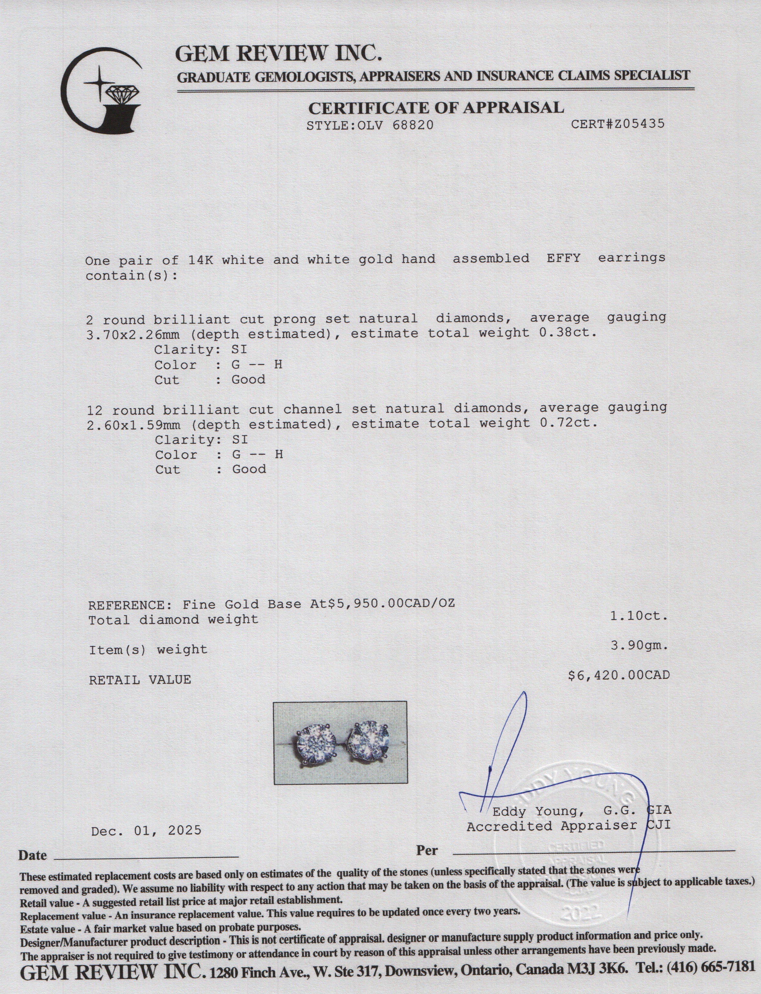 Effy 14k White Gold 1.10 tcw. Diamond Cluster Stud Earrings w/ Box